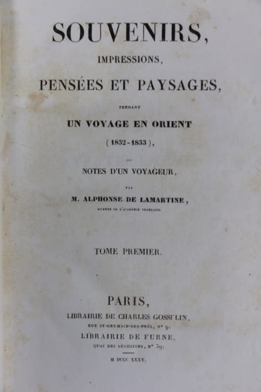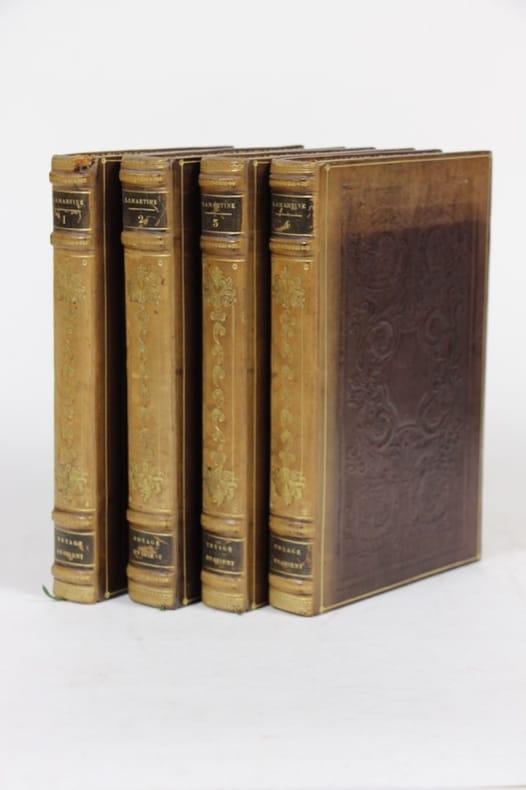 Edition originale de ce journal de voyage, de juillet 1832 à septembre 1833, en Grèce, à Malte, Chypre, en Palestine, au Liban, en Syrie, Turquie, Serbie et dans les Pays balkaniques. Les faux-titres portent tous l'intitulé : Oeuvres complètes de Lamartine. Très bon exemplaire de ce classique, en reliure romantique du temps. Bon état d’occasion