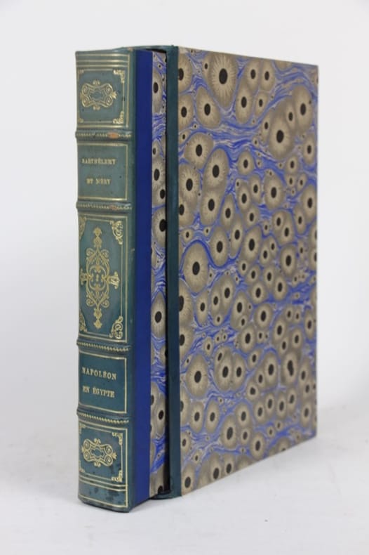 Paris, P., Ernest Bourdin, impr. Schneider et Langrand, à Paris 1828 In-4 sous étui carton jaspé bordé basane bleue, chemise demi-basane bleue, dos à nerfs ornés de roulettes et encadrés de fers dorés, un volume broché, couvertures et dos ornés conservés, 120 gravures in-texte et 17 hors-texte, celles-ci tirées sur Chine contrecollé. Couverture un peu fané, fendillée en pied, cahier de titre et faux-titre délié, brunissures marginales des planches débordant les serpentes. Bon exemplaire.