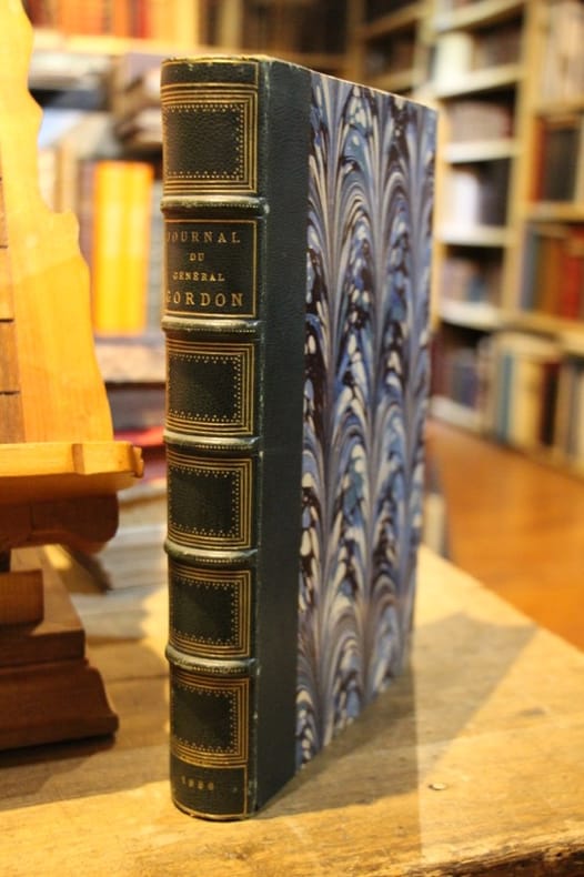 Paris, Librairie de Firmin-Didot et Cie 1886 In-4 25 x 15,5 cm. Reliure demi-chagrin bleu signée M. ritter Rel., dos à nerfs, caissons ornés de cadres dorés, tête dorée, XLIII-454 pp., portrait de Gordon en frontispice, 2 cartes et 18 gravures, table des matières. Très bon exemplaire.