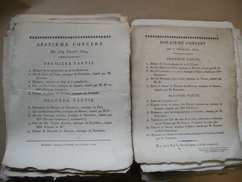 Société de Concerts marseillaise fonctionnant par abonnement et proposant concerts et "concerts spirituels au Bénéfice des Pauvres" à ses souscripteurs. Le répertoire comprend le répertoire orchestral (Symphonies, Ouvertures d'Operas), des chœurs, morceaux de solistes vocaux ou instrumentaux mélant professionnels et amateurs. La plupart des compositeurs se situent entre 1775 et 1820. Le 20 décembre 1824 : " L'administration prévient Messieurs les Souscripteurs que, le jour de la Noël, la Messe de Haydn sera exécutée, à la Cathédrale, par Messieurs les Amateurs ".Cet ensemble, bien que fragmentaire, donne une excellente idée de ce qu'était la vie musicale d'une grande ville de province en France sous la Restauration.Chanteurs et artistes professionnels, en tournée ou en résidence en Provence, participent aussi bien que des amateurs.