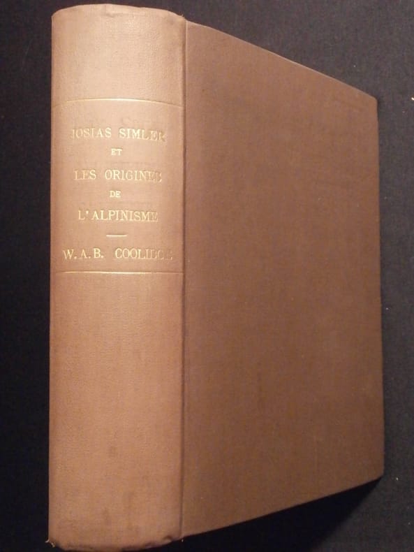 Édition originale rare. L'ouvrage se présente comme une grande édition commentée du texte fondateur de l'humaniste zuricois Josias Simler (1530-1576), De Alpibus commentarius (Zürich, 1574), reprenant l'ensemble des textes écrits par des auteurs tant classiques que modernes sur le sujet, et formant le premier ouvrage exclusivement dédié aux Alpes. Il en est ici proposé une version critique, avec traduction et un imposant appareil de notes et de commentaires.L'Américain William Augustus Brevoort Coolidge (1850-1926) était à la fois prêtre épiscopalien et alpiniste chevronné, figure remarquée du "silver age" de cette discipline : sa première ascension eut lieu en 1867 à Piz Badile. À partir de 1885, il se fixa définitivement en Suisse où il mourut en 1926.Étiquette ex-libris de Georges Allix contrecollée sur les premières gardes. - - VENTE PAR CORRESPONDANCE UNIQUEMENT