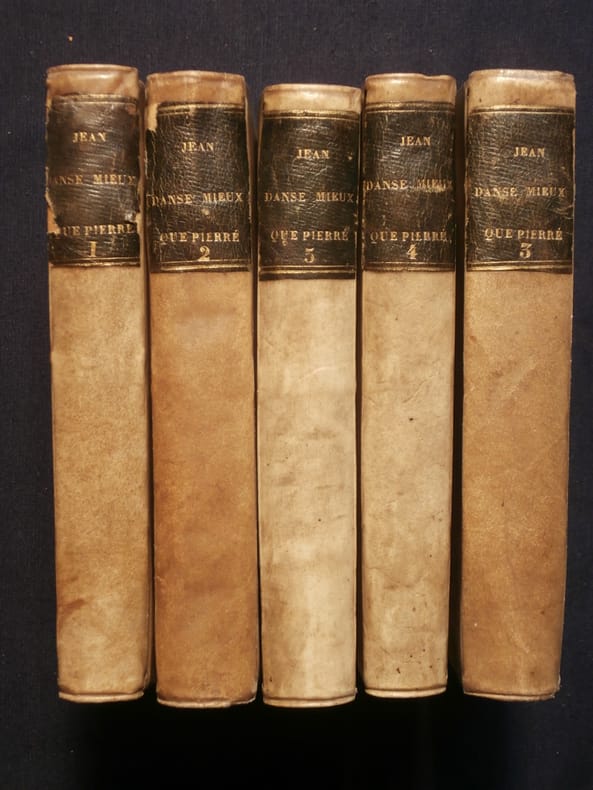 Rare édition illustré d'un portrait du père de la Chaise. Cet ouvrage est composé de 2 parties réunies sous le titre Jean danse mieux que Pierre, Pierre dans mieux que Jean, ils dansent bien tous les deux, qui reprend un refrain populaire. Selon le libraire hollandais van Duren, cité par Barbier et Quénard, ce titre aurait été trouvé par Jean Pierre Nicolas du Commun, dit Véron, pasteur à Etupes dans le Doubs. Les 2 premières tomes renferment lh'histoire du père la Chaize, jésuite et confesseur du roi Louis XIV, attribué à Philibert Joseph le Roux. 1e édition en 1693. Ouvrage satirique vivement condamné par les jésuites. Les 3 derniers tomes renferment les Entretiens du père Bouhours et du père Menetier, autre satire contre les jésuites.