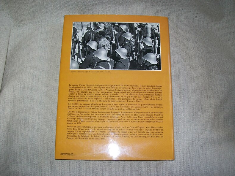 Minutieuse étude, référence pour les collectionneurs, tant par la documentation historique, que par la description des particularités de chaque casque. Ce tome I, complet pour les sujets traités, présente les casques de la France, de la Belgique, de la Grèce, du Luxembourg, de l'Italie, de la Hollande, de la Pologne, de la Roumanie et des Etats Unis. (2836)