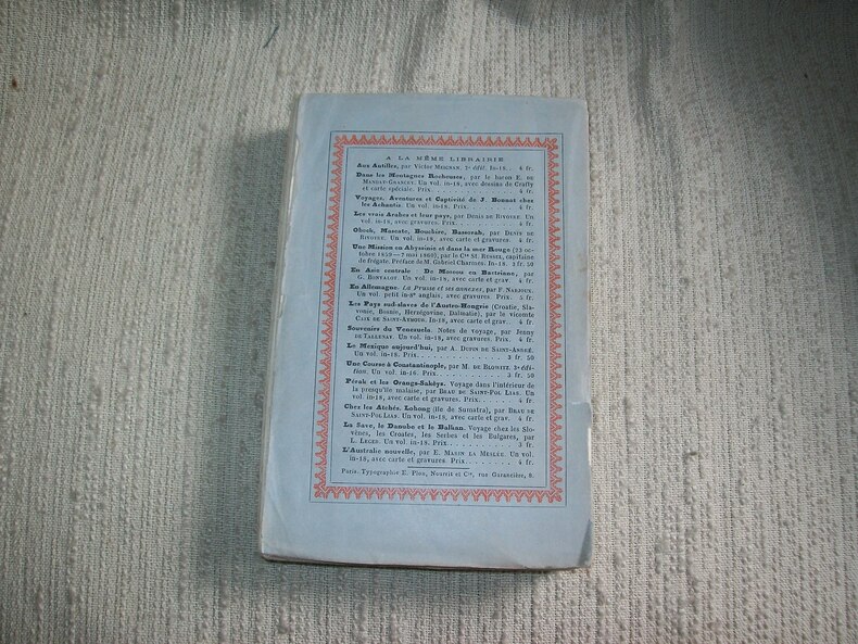 Paris Plon 1885. In-18 broché X 394pp. Orné de 15 gravures hors texte dont 1 sur double page, d'après des croquis de l'auteur et des photographies, 1 carte dépliante en couleurs, placée en frontispice. Petites coupures en bordure de la couverture. Exemplaire frais, complet de toutes ses gravures et de sa carte.
