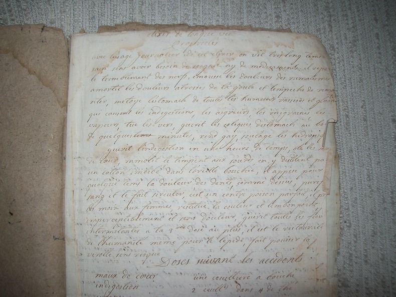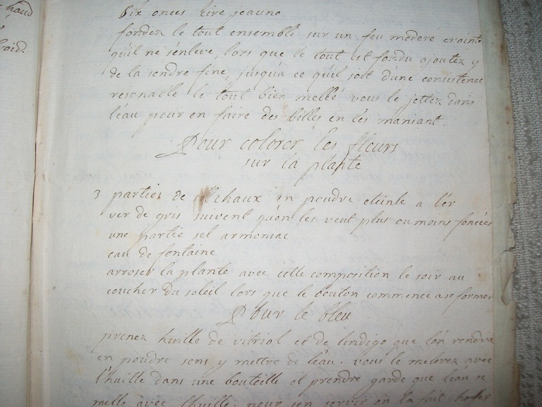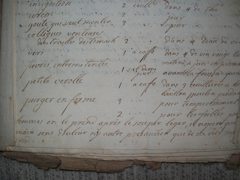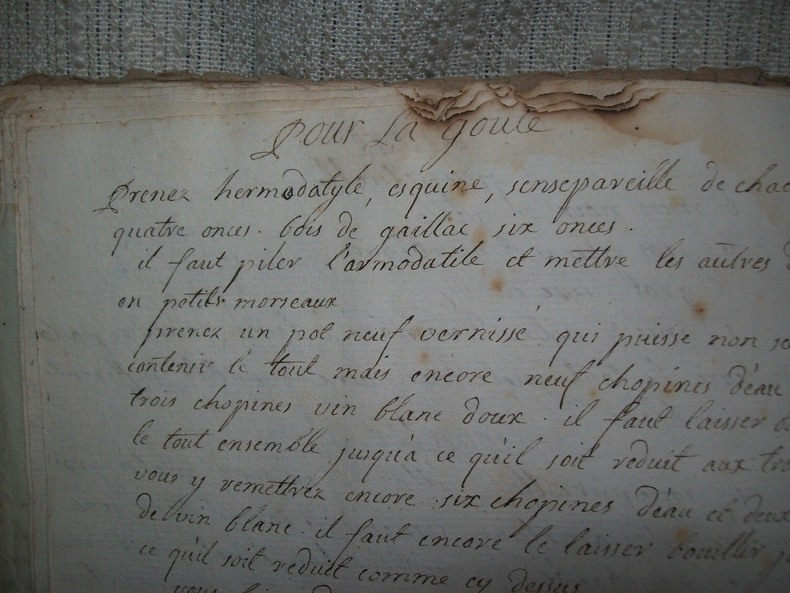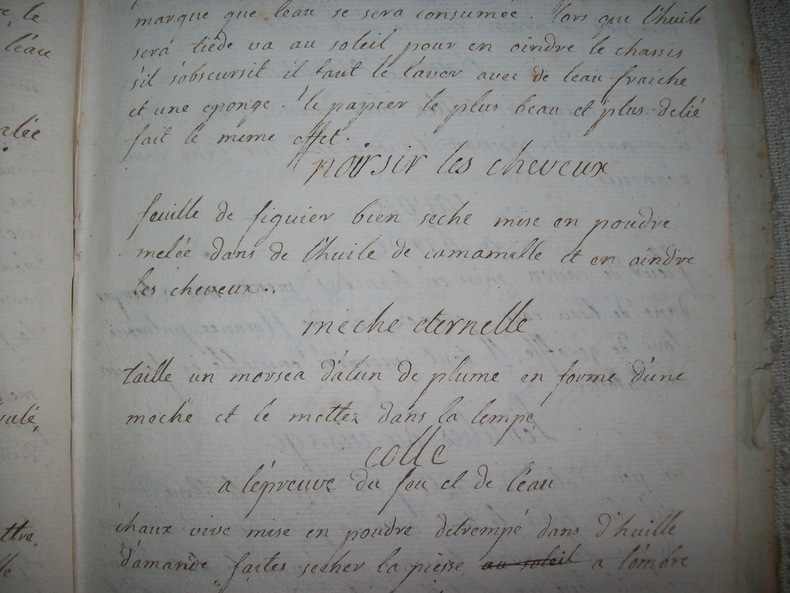 Recueil en langue française de 84 recettes (y compris celles du supplément et du feuillet indépendant), rédigées pratiquement sans marges, petits interlignes, écriture bien lisible. Les recettes se suivent sans ordre particulier et sont décrites avec plus ou moins de détails. On trouvera aussi bien un remède contre la rage, un contre l'épilepsie, qu'une pommade contre les gerçures, le moyen de calmer la migraine ou, plus curieux, celui pour ne pas dormir. Le recueil contient aussi plusieurs recettes pour fabriquer de l'encre, colorer les fleurs, imiter le faux marbre, ôter les taches mais aussi fabriquer du savon à barbe, teindre les cheveux en noir, fabriquer du parfum en poudre. Cet intéressant et curieux recueil en langue française fut probablement composé par un apothicaire ou une ménagère instruite originaire de Provence ou du Languedoc. On trouvera, en effet, une recette pour la préparation des olives picciolines; l'huile d'olive est employée dans plusieurs recettes, à noter aussi l'utilisation de la feuille de figuier pour noircir les cheveux.