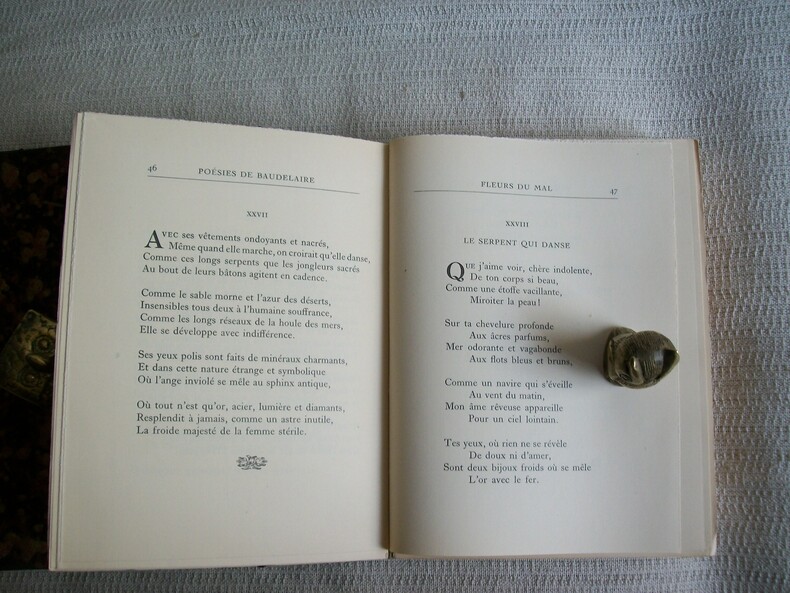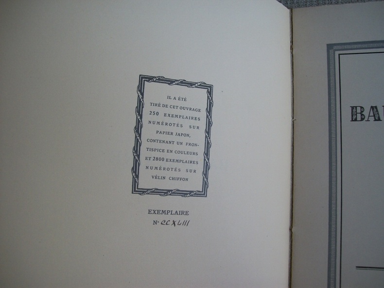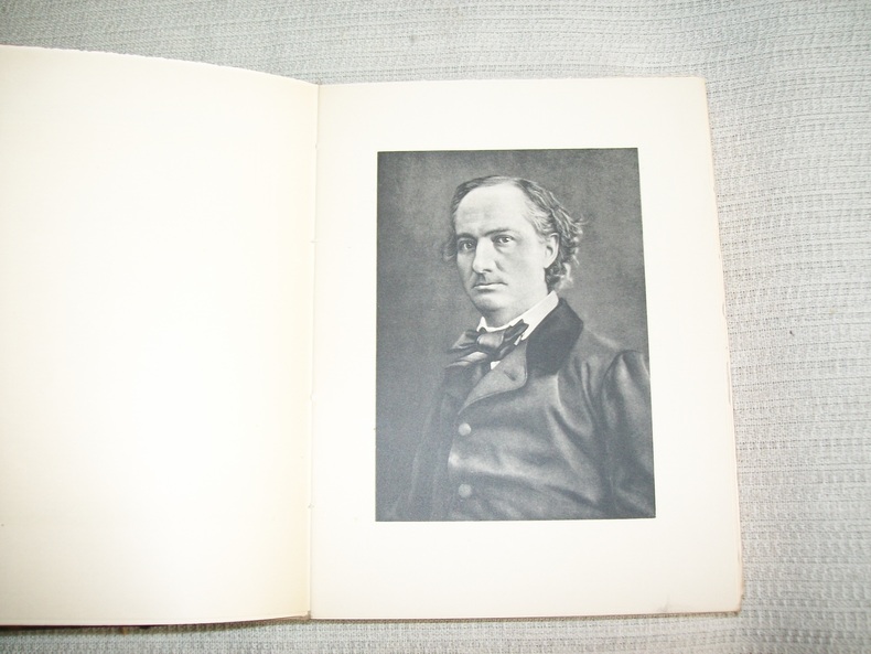 Paris Piazza Le Livre Français 1926. In-8 broché 3 feuillets non chiffrés (faux-titre, titre, portrait) XIX 1 feuillet non chiffré 300pp 1 feuillet non chiffré (numéro d'ordre dans la collection, achevé d'imprimer) sous étui recouvert de beau papier noir et doré, pièce de titre rouge sur le dos. Décoration gravée d'après les dessins de Pierre Courtois, beau portrait hors texte de Baudelaire. 1 des 250 exemplaires sur papier Japon numérotés à la main en chiffres romains SANS LE FRONTISPICE EN COULEURS ANNONCE POUR LES EXEMPLAIRES SUR JAPON. Bel exemplaire très frais, complet du texte et du portrait MAIS sans le frontispice en couleurs.