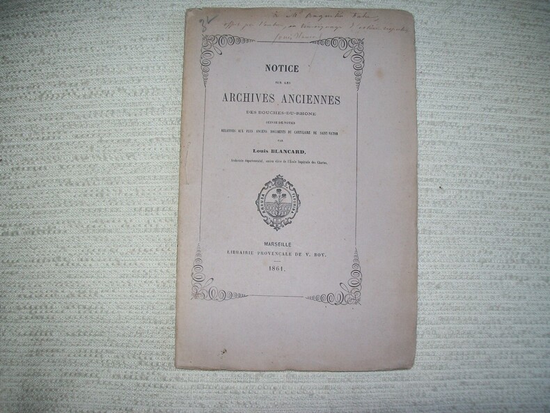 Marseille Librairie Provençale de Boy 1861. In-8 broché 2 feuillets non chiffrés 32pp. Orné d'un tableau à pleine page. Imprimé sur beau papier. Cachet ex-libris sur le faux-titre "G Leroy". Bel exemplaire frais, enrichi d'un envoi à Augustin Fabre en tête du 1er plat de la couverture. Les pages 21 à 32 présentent des notes sur le polyptique de Wadalde (814) et sur les plus anciennes chartes du cartulaire de Saint Victor. (PLAQ 25)