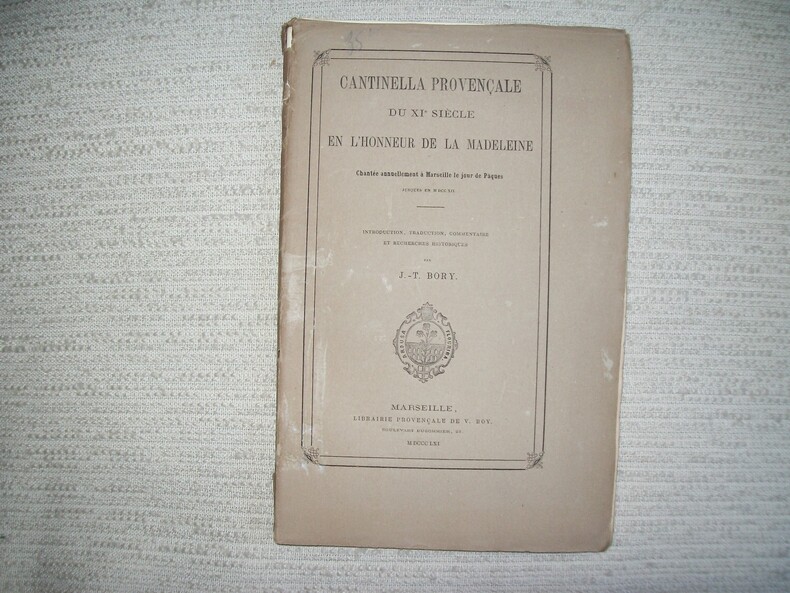 Marseille Librairie Provençale de Boy 1861. In-8 broché 1 feuillet non chiffré 63pp. Orné en frontispice (extérieur et autel) de l'oratoire de la Magdeleine (1615-1780). Tiré à 100 exemplaires sur beau papier. Petits manques et coupures sur le dos de la couverture, coupure et tache blanche en bordure interne du 2e plat de celle-ci. Intérieur frais. (PLAQ 25)