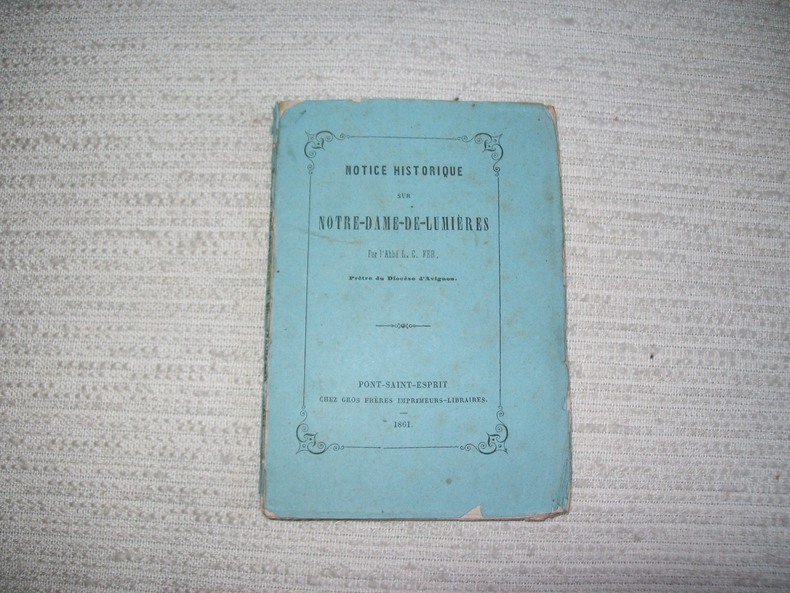Pont-Saint-Esprit chez Gros Frères 1861. Petit in-12 broché 2 feuillets non chiffrés 144pp. Petits manques de papier au bas et en bordure du dos, quelques pâles et rares rousseurs, 2 cachets ex-libris et 1 ex-libris ancien sur 1 feuillet blanc. Joli petit livre consacré à ce sanctuaire édifié sur la commune de Groult, arrondissement d'Apt dans le Vaucluse. (PLAQ 25)