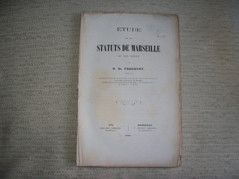 Aix / Marseille Makaire-Cruège 1865 in 8 1 volume broché, 171 pages, couverture légérement défraichie. R. de Fresquet, Professeur à la Faculté de Droit d'Aix, membre de la Société d'Emulation de Marseille, des Académies d'Aix, de Toulouse et de Toulon. Envoi autographe signé de l'auteur à M. Labraque de Bordenave avocat. Bon exemplaire
