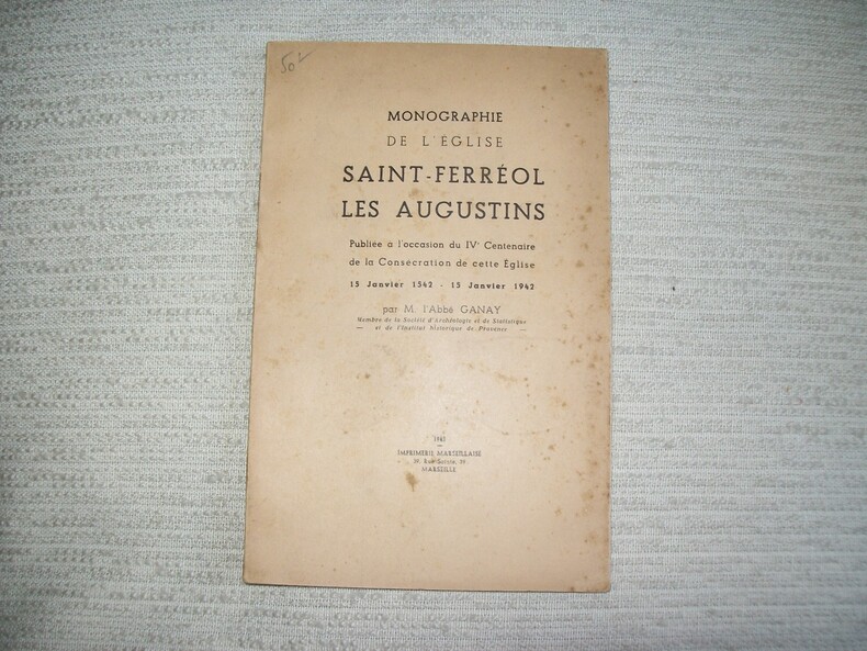 Marseille Imprimerie Marseillaise 1942. In-12 broché 4 feuillets non chiffrés 46pp 1 feuillet blanc. Avec 15 planches en fin d'ouvrage réunissant 15 portraits d'ecclésiastiques, 5 vues de l'église ou de son mobilier. Cachet ex-libris au bas du faux-titre, rousseurs sur la couverture, intérieur très frais et complet. (PLAQ 25)