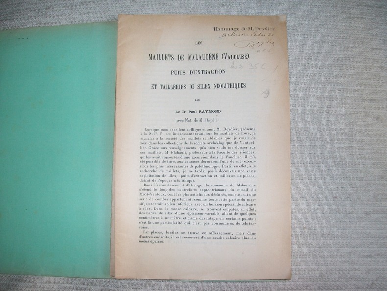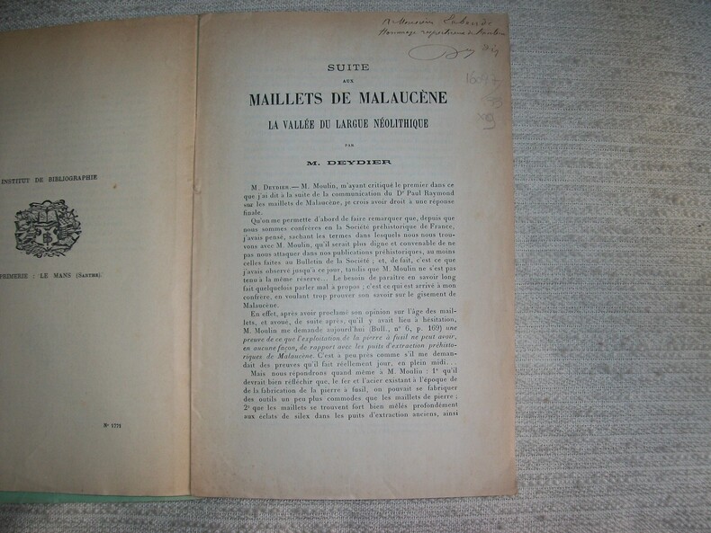 Le Mans Monnoyer 1905. 2 plaquette n-16 brochées sous couverture muette l'une de 10pp et l'autre de 3pp. Avec 1 planche imprimée et 2 photos originales par M Deydier, annotées à l'encre, toutes les trois représentant des objets de fouilles. Rousseurs sur la couverture, intérieur très frais. Chacune de plaquette est enrichie d'un envoi de m Deydier à l'historien Labande. (PLAQ 25)