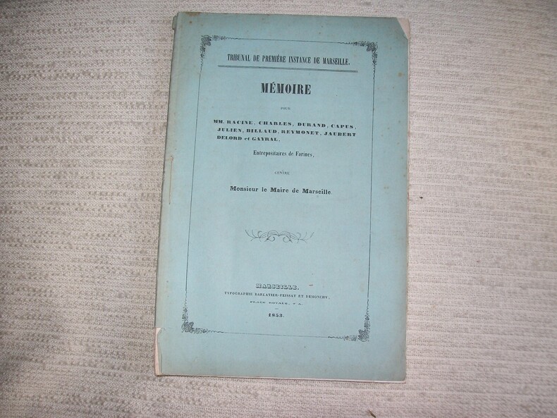 Marseille Barlatier-Feissat et Demonchy 1853. In-16 broché 40pp. Manque angulaire au bas du 2e plat de la couverture, quelques pâles rousseurs. Compte-rendu des avocats Clapier et Oddo au sujet d'un litige opposant neuf maisons de commerce de Marseille au Maire, au sujet des taxes de l'octroi. (PLAQ 25)