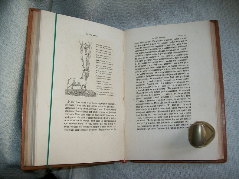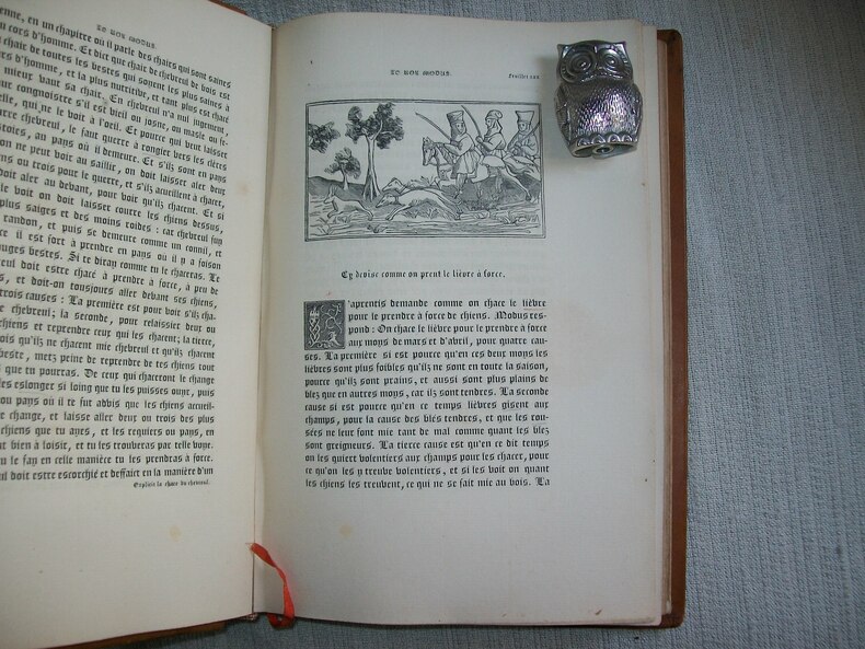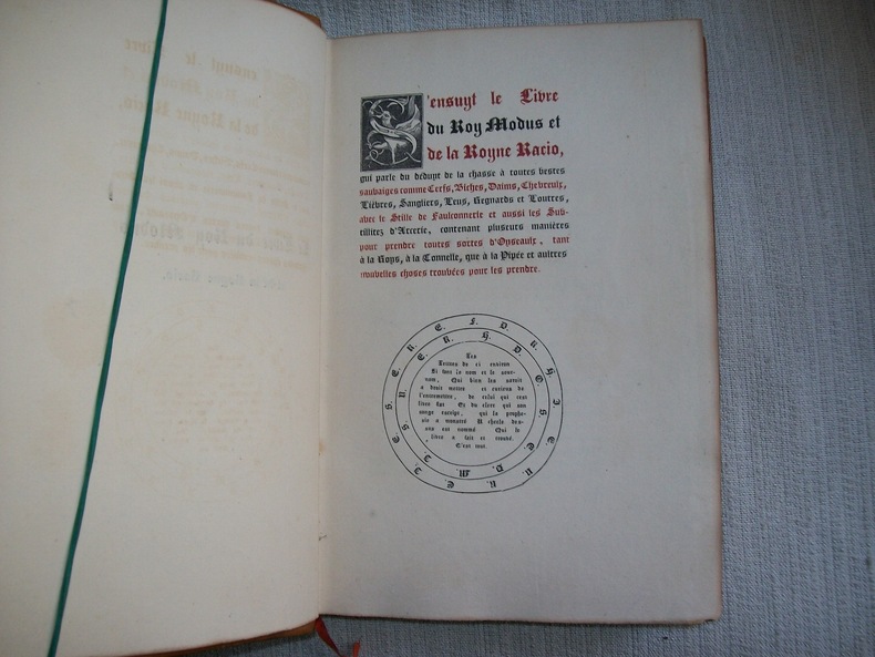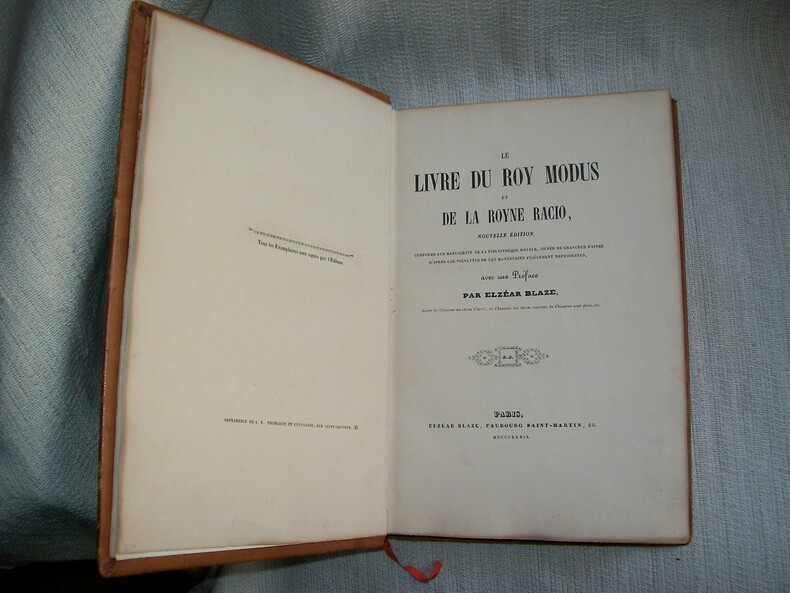 Ouvrage anonyme attribué à Henry de Ferrières, gentilhomme Normand. Composé vers 1354-1370, il est considéré comme le plus ancien traité de chasse en langue française. Cette édition du XIXe siècle, offre le texte en caractères gothiques et en français du XIVe siècle, est due à Elzéar Blaze (né à Cavaillon en 1788, décédé à Paris en 1848), qui fut l'un des grands spécialistes de la chasse de son époque. Le Roy Modus explique les techniques de chasse, tandis que la Royne Ratio présente des considérations morales sur les moeurs des animaux.