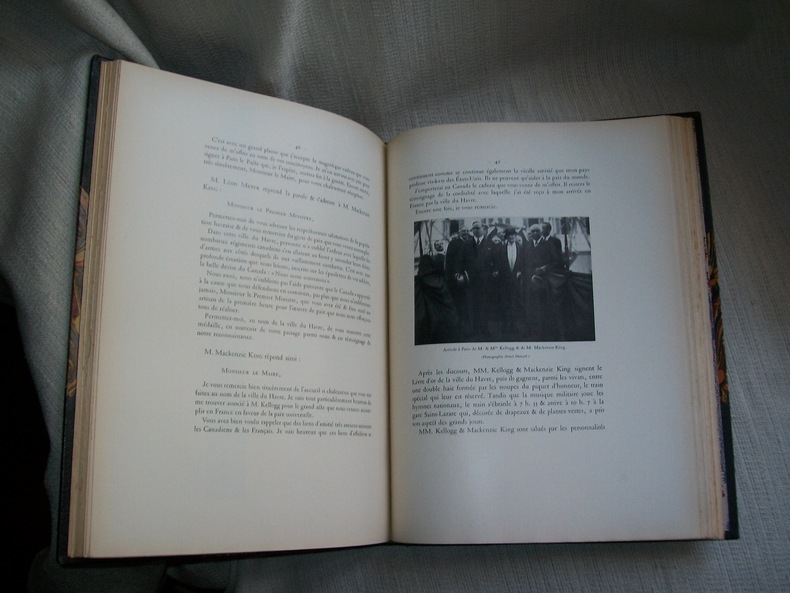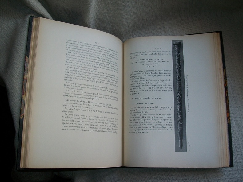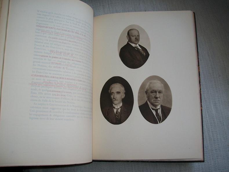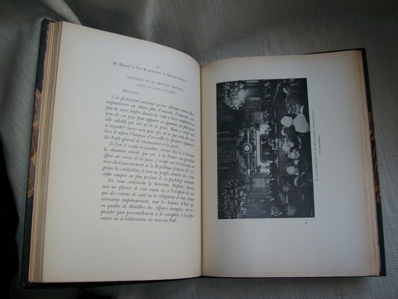 Paris Imprimerie Nationale 1929. In-4 5 feuillets non chiffrés XII-XIII 2-127pp 2 feuillets non chiffrés dont la table des matières. Demi basane maroquinée verte à coins signés, dos lisse entièrement orné en long d'une succession de palmes dorées, liées à un filet doré central avec pastilles mosaïquées rouges intercalées; pièce de titre rouge soulignée d'une chaînette, tête dorée, non rogné, 1er plat de la couverture aux Armes dorées de la Ville de Paris conservée, reliure de l'époque. Orné d'illustrations en similigravure dans le texte, 10 à pleine page ou hors texte (2 de celles-ci en couleurs); 1 planche sur double page (fac simile du traité avec les sceaux en couleurs); 1 fac simile hors texte recto verso (livre d'or de la Ville de Paris avec signature des Plénipotentiaires), 20 très beaux portraits hors texte en héliogravure (12 réunis sur 4 planches). Dos uniformément passé au marron, intérieur très frais et complet. Reliure de l'époque en bon état et décorative, malgré le défaut signalé
