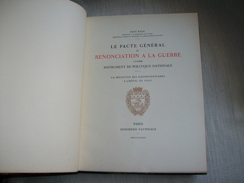 Le Pacte Briand-Kellogg, traité signé par soixante-trois pays, stipulait dans son article 1 : "Les Hautes Parties contractantes déclarent solennellement au nom de leurs peuples respectifs qu’elles condamnent le recours à la guerre pour le règlement des différends internationaux, et y renoncent en tant qu’instrument de la politique nationale dans leurs relations mutuelles". Le pacte Briand-Kellogg n'a pas rempli son objectif de mettre fin à la guerre, et, dans ce sens, il n'a pas contribué directement à assurer la paix dans le monde. Il a été relativement inefficace dans les années qui ont suivi sa ratification. Néanmoins, le pacte est significatif dans l'histoire du droit international, puisqu'il a représenté après la Seconde Guerre mondiale le fondement juridique, bien que très controversé, pour les accusations de "crime contre la paix" contre des Allemands au procès de Nuremberg. Voir le sommaire sur photos jointes.
