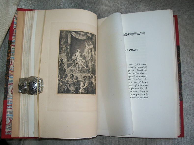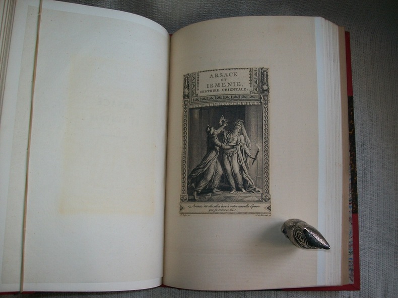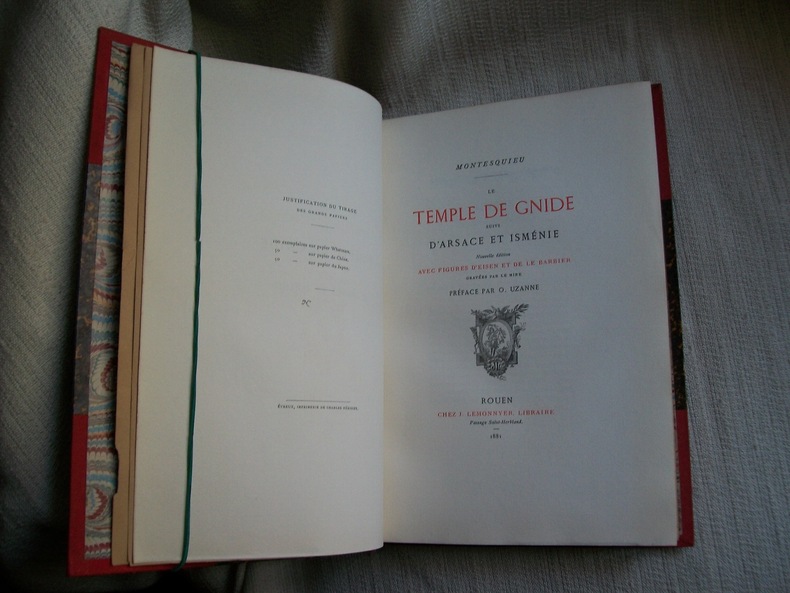 Rouen chez J Lemonnyer 1881. Grand in-8 2 feuillets non chiffrés II-XXIII 2-160pp 1 feuillet non chiffré table. Demi percaline rouge bradel à coins, dos orné au centre d'un fleuron doré, pièce de titre tabac, tête dorée, reliure de l'époque.Orné de 15 belles gravures: 1 tête de chapitre armoriée an double état et 14 hors texte sur papier chamois, d'après Eisen et Le Barbier y compris le portrait allégorique de Montesquieu et le titre-frontispice de l'édition du XVIIIe siècle. Vicaire Tome V, colonne 1102. 1 des 600 exemplaires sur papier de Hollande non justifiés. Reliure sobre et solide, intérieur très frais, à grandes marges et complet.