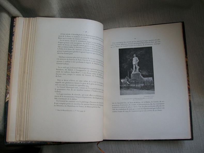 Paris Imprimerie Nationale 1927. In-4 5 feuillets non chiffrés XII-XIII 2 feuillets non chiffrés 2-91pp 2 feuillets non chiffrés dont table des matières. Demi basane maroquinée verte à coins signés, dos lisse entièrement orné en long d'une succession de palmes dorées reliées à un filet central doré avec pastilles mosaïquées rouges intercalées; pièce de titre rouge soulignée d'une chaînette; tête dorée, non rogné, 1er plat de la couverture aux Armes de la Ville de Paris dorées conservée, reliure de l'époque. Nombreuses illustrations en similigravure dans le texte et hors texte dont 2 rehaussées de couleurs (affiches, documents, scènes des funérailles ou autres, vues, monuments érigés en hommage à Galliéni) et 4 très beaux portraits hors texte en heliogravure. Dos uniformément passé au marron. Intérieur très frais et complet. Reliure en bon état malgré le défaut signalé et décorative.