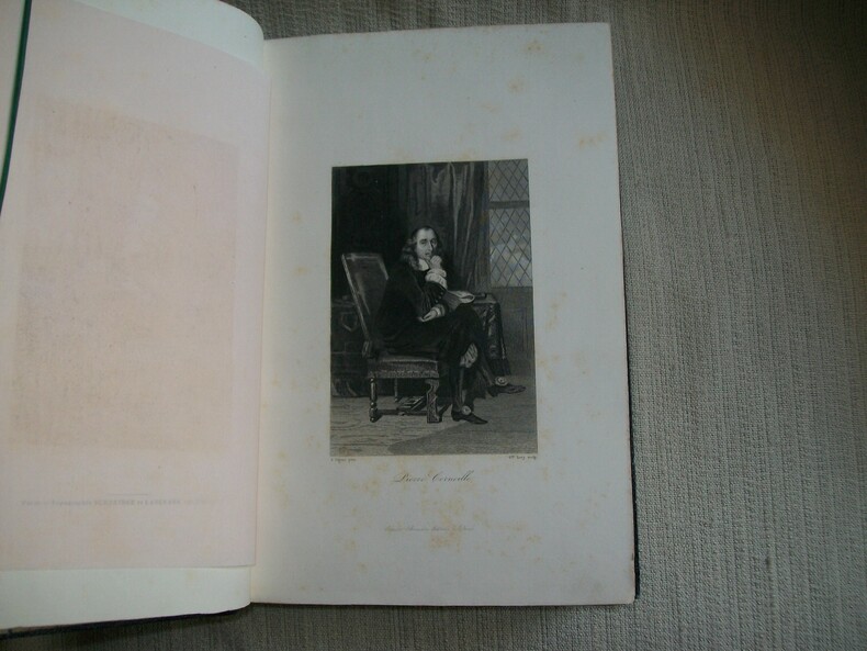 Paris Ernest Bourdin sans date (1843). Grand in-8 2 feuillets non chiffrés 2-652pp. Demi chagrin bleu nuit, dos à 4 nerfs rehaussés d'une barrette dorée, plats de papier chagriné bleu nuit, reliure de l'époque. Orné d'une vignette sur le titre, de nombreuses lettrines animées, illustrations dans le texte et 24 gravures sur acier hors texte d'après Alfred Johannot, Bellangé et autres artistes y compris le portrait de Pierre Corneille en frontispice et le titre-frontispice; 2 cartes hors texte. Pâles rousseurs par endroits. Bel exemplaire, malgré le défaut signalé, complet dans une reliure sobre typique de l'époque, en très bon état et décorative; Vicaire IV, colonne 539. PREMIERE EDITION.