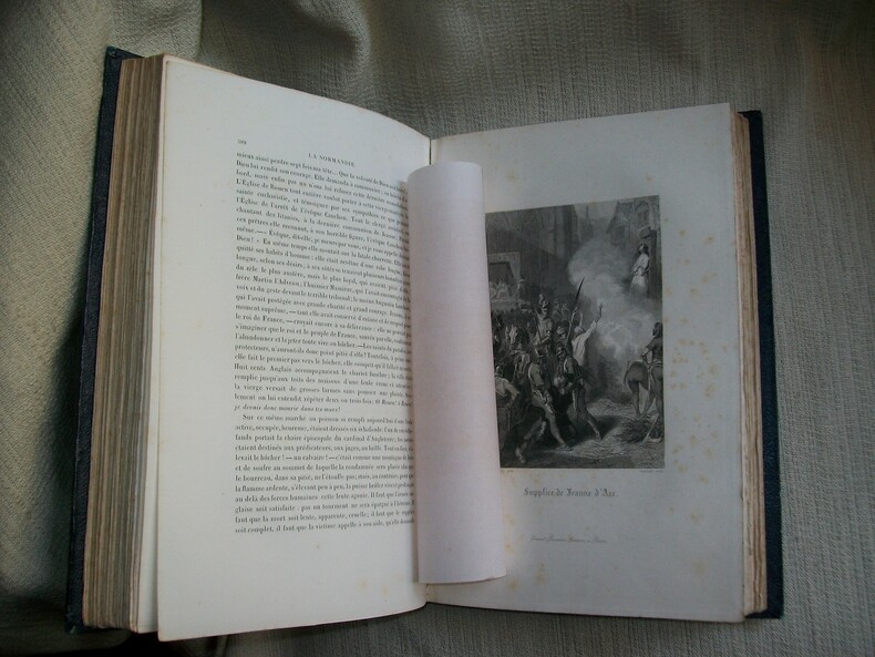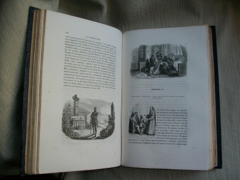Edition illustrée de 150 vignettes in texte gravées sur bois et de 24 beaux hors-texte (dont 2 cartes) gravés sur acier d'après Morel-Fatio, Tellier, Gigoux, Daubigny, Debon, H. Bellangé et Alfred Johannot. Elle comporte également 8 gravures coloriées supplémentaires, dont 2 de blasons et 6 de costumes, qui ne se trouvent pas dans la première édition de 1843. Les couvertures spéciales en chromolithographie ont été conservées. Premier tirage (le cul de lampe page 650 n'annonçe pas "La Bretagne" parue l'année suivante).