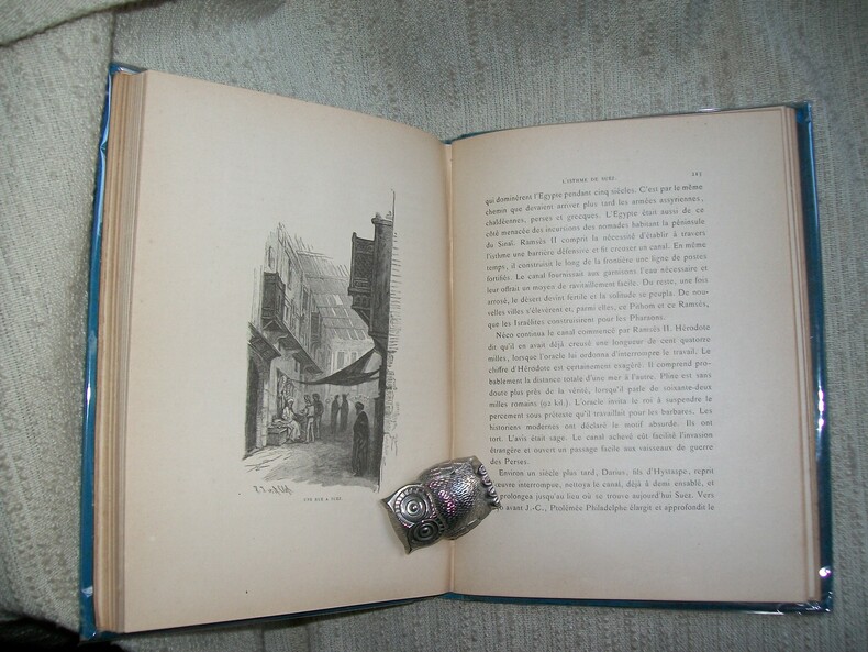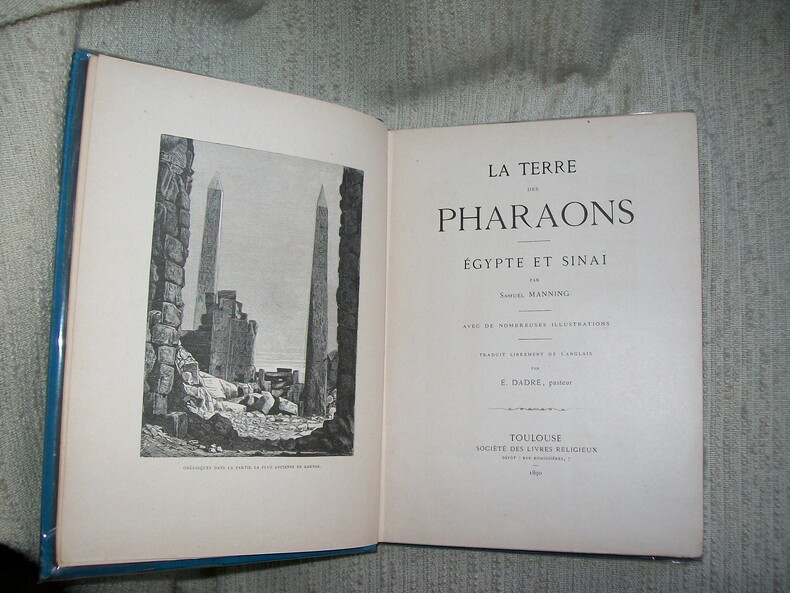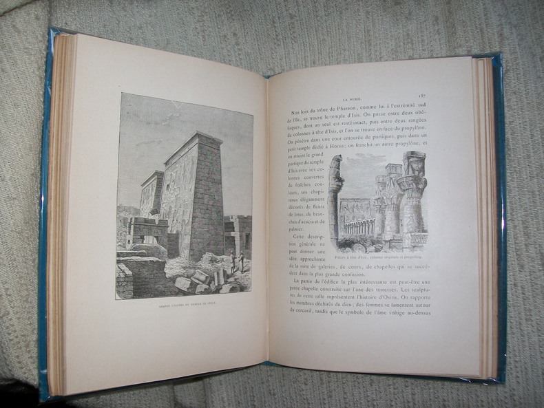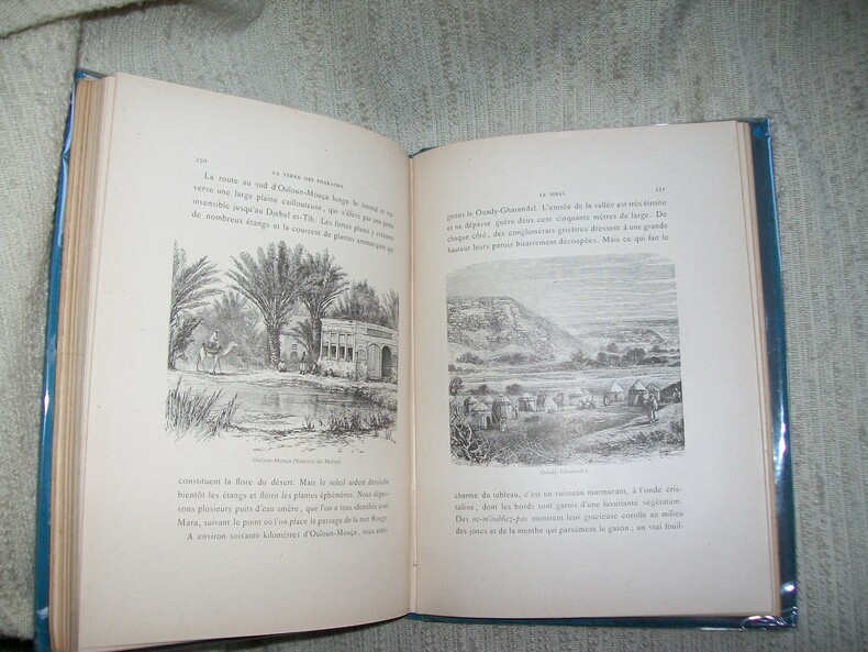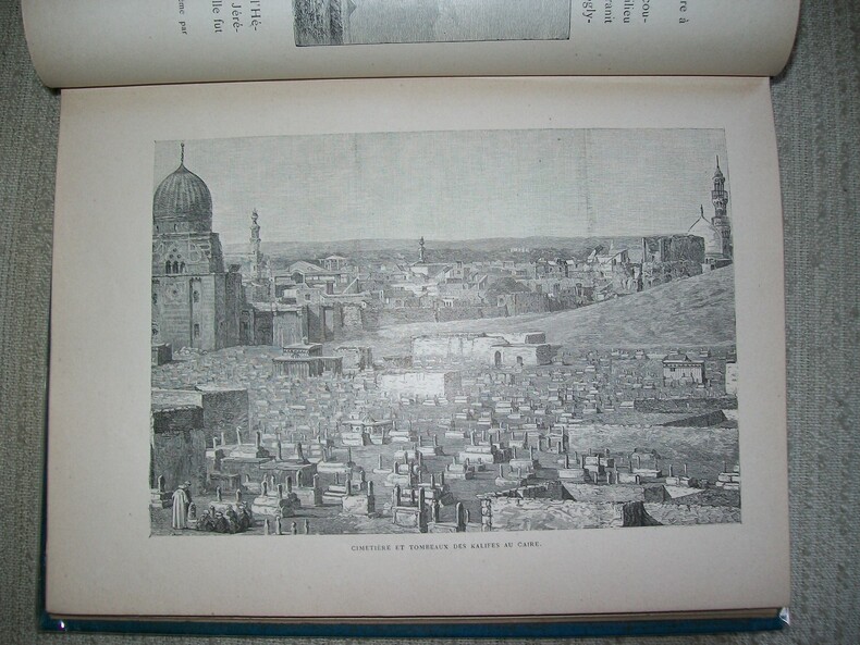 Toulouse Société des Livres Religieux 1890. In-8 carré 262pp 1 feuillet de table. Cartonnage de l'éditeur en percaline bleu ciel bradel, dos entièrement orné de végétaux stylisés et volutes dorés, titre doré sur le 1er plat sur fond de palmiers en noir et grande plaque dorée représentant la mosquée Al-Azhar du Caire. Orné de nombreuses illustrations dans le texte et de 40 hors texte comprises dans la pagination dont le frontispice (monuments, scènes de vie, vues). Bel exemplaire très frais et complet. Cartonnage solide et décoratif. Voyage au Delta du Nil, en Haute Egypte, en Nubie, à l'Isthme de Suez et au Sinaï.