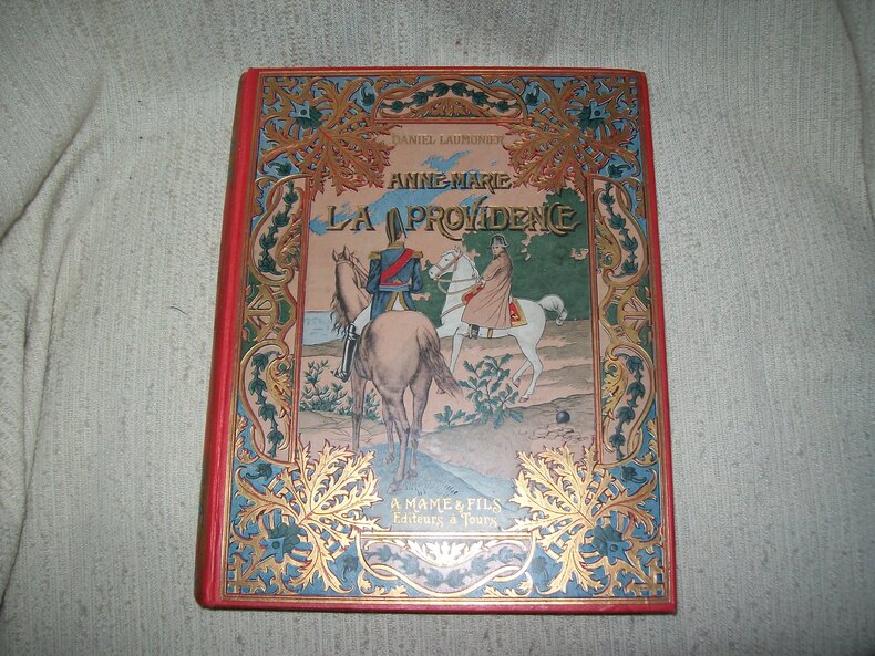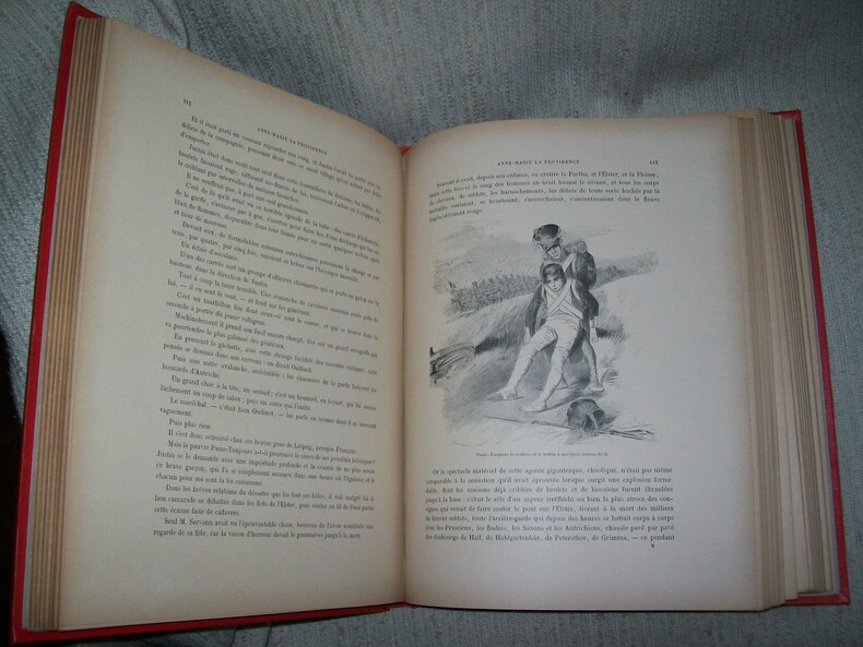 Tours Maison Alfred Mame et Fils sans date vers 1900. Grand in-4 (31,5cm x 24,5cm) 4 feuillets non chiffrés 318pp 1 feuillet non chiffré de table. cartonnage éditeur de percaline rouge bradel, dos orné en tête et en queue de motifs verts et dorés, 1er plat entièrement décoré d'une composition polychrome (Napoléon à cheval et l'un de ses maréchaux) dans un grand cadre de végétaux verts et dorés entrelacés, marque de l'éditeur en noir au centre du 2e plat, tranches dorées. Orné de 70 dessins en noir dont 4 hors texte compris dans la pagination, bien représentatifs des costumes et uniformes du 1er Empire. Coupure sans manque (6,5cm) en marge latérale de la page 185. beau cartonnage solide, très frais et décoratif.