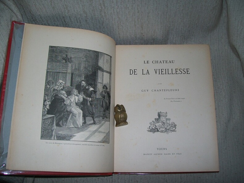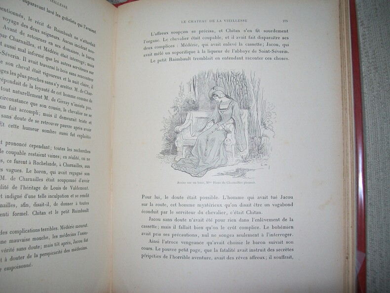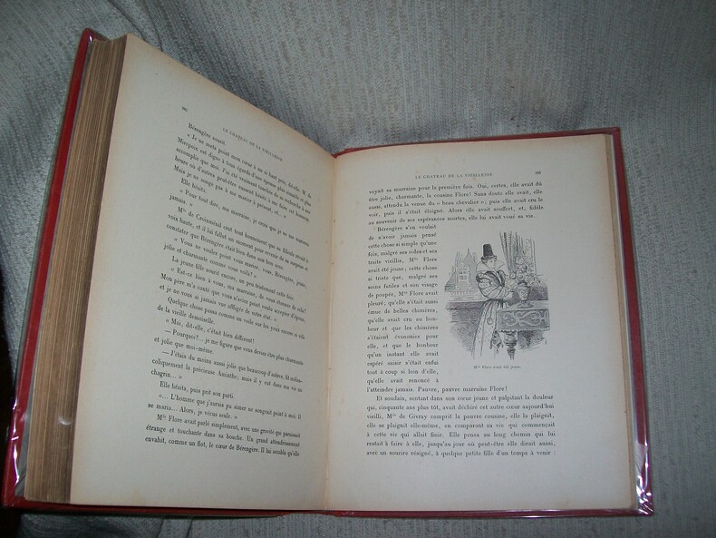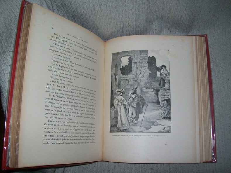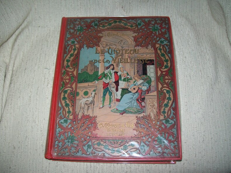 Tours Maison Alfred Mame et Fils sans date vers 1900. Grand in-4 (31,5cm x 24,5cm) 4 feuillets non chiffrés 319pp. Cartonnage éditeur percaline rouge bradel, dos orné en tête et en queue de motifs verts et dorés, 1er plat entièrement décoré d'une composition polychrome (jeune musicienne, gentilhomme et servante en costumes Louis XIII) dans un cadre de végétaux verts et dorés, marque de l'éditeur en noir au centre du 2e plat, tranches dorées. Avec 48 dessins en noir dont 6 hors texte compris dans la pagination (frontispice inclus dans ce compte). Quelques pâles rousseurs par endroits. Bel exemplaire, cartonnage très frais, solide et décoratif.