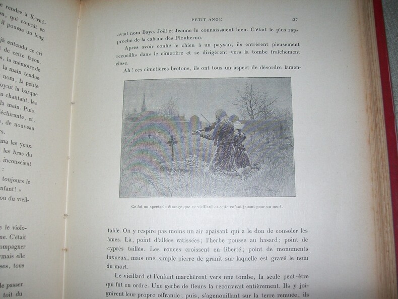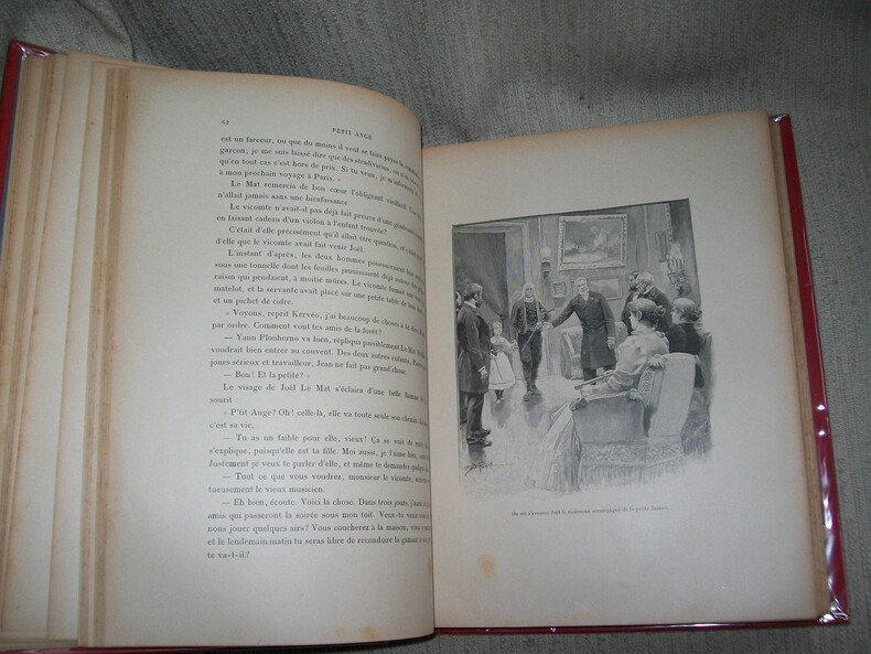 Tours maison Alfred Mame et Fils sans date vers 1900. Grand in-4 (31,5cm x 24,5cm) 5 feuillets non chiffrés 317pp 1 feuillet non chiffré de table. Cartonnage éditeur de percaline rouge bradel, dos orné en tête et en queue de motifs verts et dorés, 1er plat entièrement décoré d'une composition polychrome (vieux violoneux Breton enseignant la musique à une fillette) dans un grand cadre de végétaux verts et dorés entrelacés, marque de l'éditeur en noir sur le 2e plat, tranches dorées. Orné de 67 illustrations de Alfred Paris dont 8 hors texte (frontispice compris)/ Quelques rousseurs par endroits. Bel exemplaire, cartonnage solide, très frais et décoratif.
