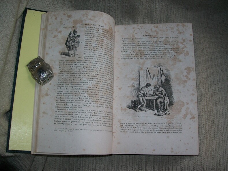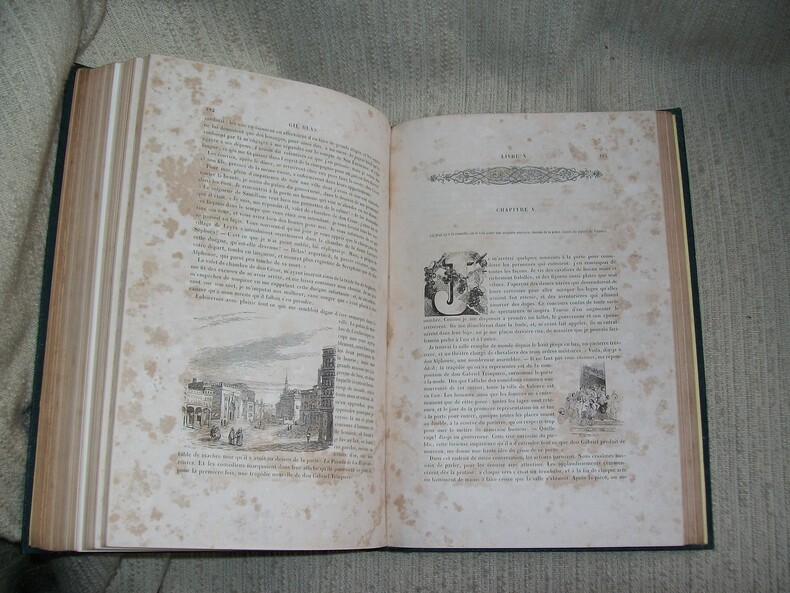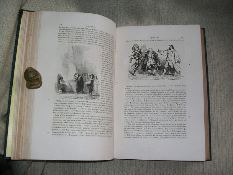 Paris Dubochet, Le Chevalier et Cie 1846. Grand in-8 3 feuillets non chiffrés LV 1 feuillet non chiffré 630pp. Cartonnage de l'éditeur de toile chagrinée bleu nuit, dos lisse orné en long de personnages picaresques dorés, belle grande plaque dorée sur le 1er plat avec portrait de Le Sage en médaillon; vignette dorée sur le 2e plat (buveurs attablés et bavardant), tranches dorées. Orné de 2 portraits hors texte, nombreuses lettrines animées, abondante illustration dans le texte par Gigoux (Gil Blas) et Meissonnier (Lazarillo de Tormes). Nombreuses pages brunies, rousseurs (fortes par endroits). Cartonnage Romantique solide, d'une grande fraîcheur, typique de l'époque et décoratif.