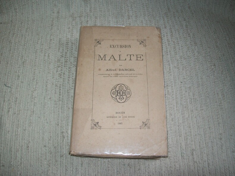 2 ff.n.ch. (titre, dédicace), 368 pp. (p. 217 mal imprimée).Unique édition, peu commune. Le titre est quand même très trompeur : seules les pp. 32 à 55 concernent Malte, tout le reste du texte est occupé par un périple en Italie (Syracuse, Messine, Naples, Rome, Pérouse, Sienne, Florence, Bologne, Ravenne et Milan).Le Rouennais Alfred Darcel (1818-1893) fut administrateur des Gobelins, et conservateur du Musée Cluny à partir de 1885