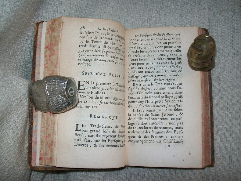 Contient: sur la chasteté et l'impudicité, les évêques et les prêtres, les diacres, le voeu de chasteté, la virginité de la Mère de Dieu, l'eucharistie, prédestination et réprobation de l'homme, la mort de Jésus-Christ, la Grâce et la liberté, la justification, la récompense des Saints et le châtiment des damnés, la divinité du Fils de Dieu, l'intercession des Saints. Ordonnances de Mgr Antoine de Barberin Archevêque de Reims, de Mgr de Paris, de Mgr l'Evêque d'Evreux et de Messire Antoine Lambert chanoine d'Embrun.