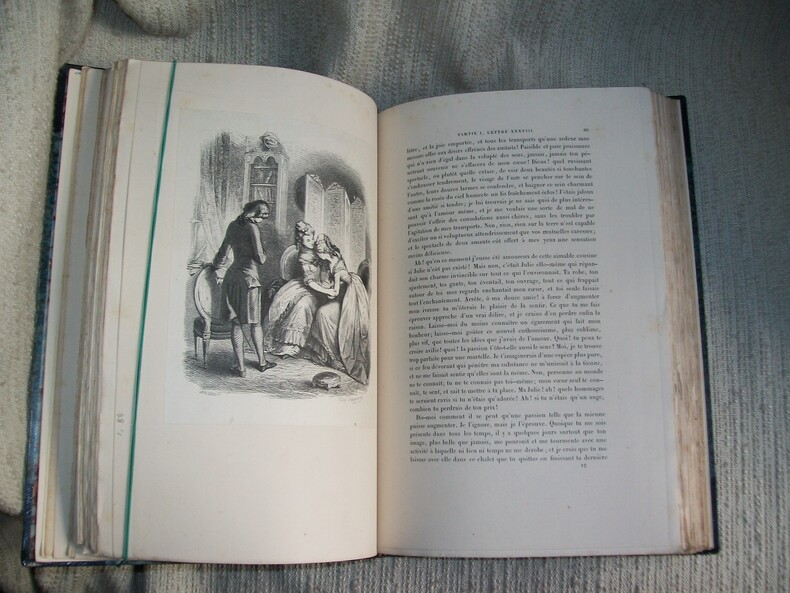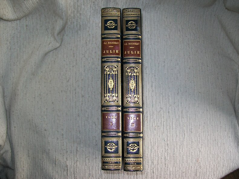 Lettres de deux amans habitants d’une petite ville aux pieds des Alpes.Recueillies et publiées par Jean Jacques ROUSSEAU.Edition augmentée d’une nouvelle préface de l’auteur.Parties en 2 volumes in 12 demi-cuir,pièce de titre cuir beige.Pièce de tomaison cuir vert,roulette, palmette,fers dorés.Tome 1:faux-titre, Julie ou la nouvelle Héloïse première partie,titre lettre de deux amants première partie préface 8 pages,seconde préface 52 pages. 199 pages.Seconde partie faux-titre,titre 214 pages. Troisième partie faux-titre,titre,195 pages.Charnières restaurées.Mouillure en marge extérieure en début du tome et en fin de 3ème partie pages 170 à la fin,pages de garde renouvelées.Volume légèrement déformé.Tome 2 :quatrième partie faux-titre,titre,282 pages.Cinquième partie(pas de page de faux-titre et de titre)280 pages Sixième partie faux-titre, titre, 264 pages,mouillure en marge inférieure en début de volume et deux mors inférieurs restaurés. Rousseurs éparses,fin de 6ème partie page 239 à la fin.A Genève 1761 .Ensemble modeste