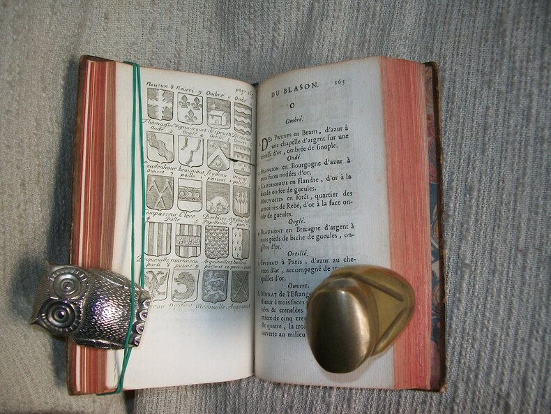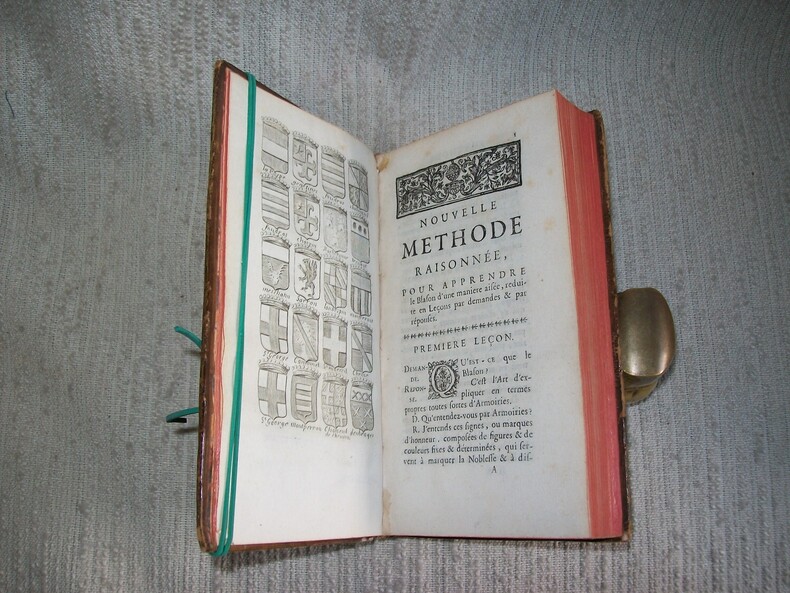 A Lyon chez les Frères Bruyset 1734. In-12 3 feuillets non chiffrés (titre, avertissement) 1-298pp 13 feuillets non chiffrés (table des noms de Maisons dont les armoiries sont citées dans le livre) 2 feuillets non chiffrés privilège. Plein veau havane marbré, dos à nerfs guillochés, cadres de filets à fleurettes dorés dans les entrenerfs, pièce de titre grenat, tranches brique, reliure de l'époque. Bandeau, lettrine, nombreuses figures (diverses figures et façon de disposer l'écu pour la composition du blason); frontispice allégorique et 32 planches regroupant chacune, en moyenne, 20 exemples d'écus avec l'identification des Maisons). Coiffe supérieure arasée. Bel exemplaire complet, frais et bien relié.