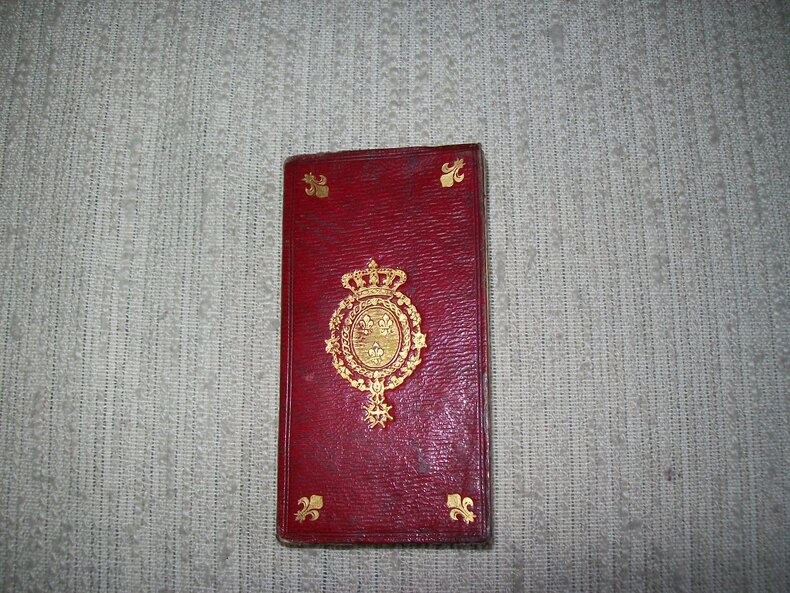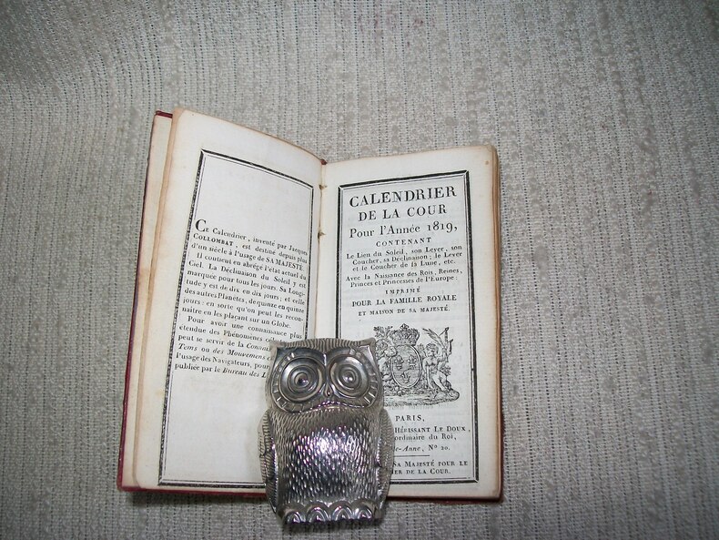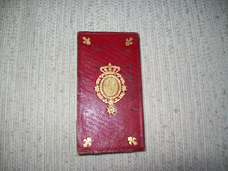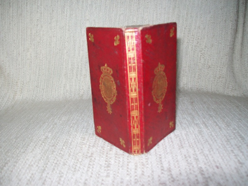A Paris chez Madame Hérissant le Doux. Petit in-12 (10,5cm x 5,5cm) 1 feuillet non chiffré (invention de ce calendrier) avec le titre au verso 4-215pp. Plein maroquin rouge à grains longs, dos lisse muet entièrement orné de filets et doubles croisillons dorés; double cadre de filet à froid sur les plats avec fleurs de lys aux angles et belles armes de France couronnées dorées au centre, tranches dorées, reliure de l'époque. Exemplaire frais et complet. Un joli petit livre, bonne source documentaire, dans sa reliure de l'époque décorative.