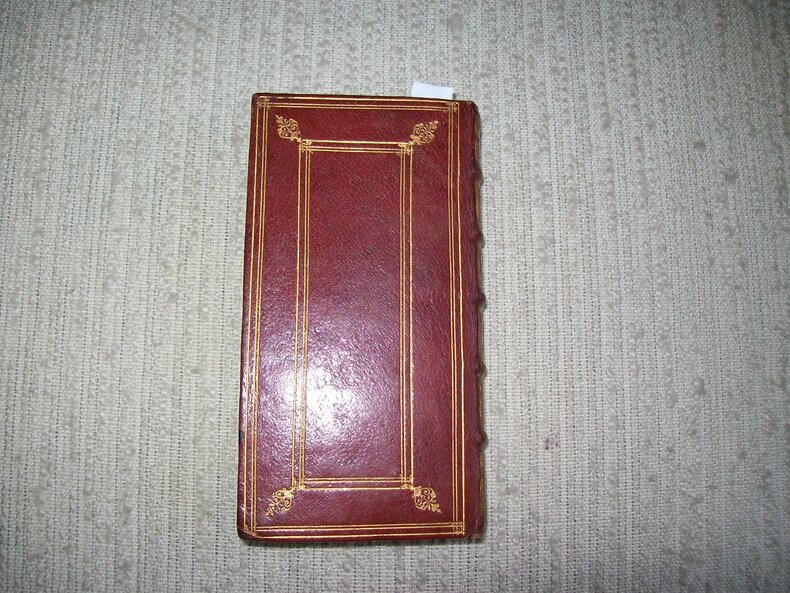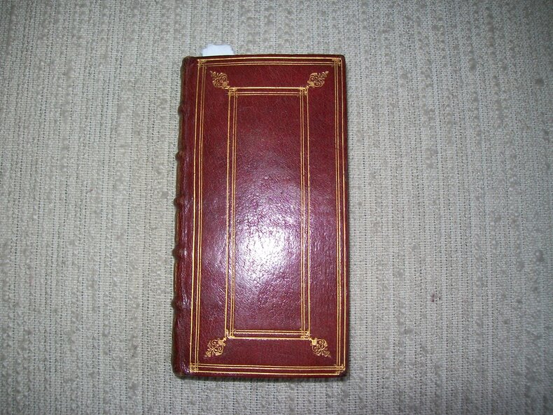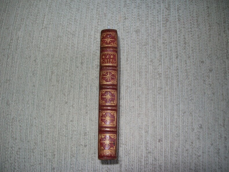 Manque la page de titre (Antverpiae ex Officina Balthasaris Moreti 1629). Petit in-12 étroit (12,5cm x 6cm) paginé 340 à 575. Plein maroquin grenat, dos à nerfs orné de cadres de filets et motifs étoilés dorés, décor de filets à la Du Seuil sur les plats, coupes guillochées, tranches dorées, reliure du XVIIIe siècle. Partie supérieure de la première page masquée à l'époque par par une pièce de papier (contenant probablement la fin du texte des lamentations de Jérémie), texte du verso de la page 575 entièrement masquée à l'époque (contenant probablement le début du texte du Livre d'Osée). FRAGMENT DU LIVRE DES PROPHETES extrait d'un ouvrage imprimé au XVIIe siècle. TEXTE COMPLET POUR LES PROPHETIES DE BARUCH, EZEQUIEL ET DANIEL imprimées en latin sans traduction. Exemplaire en bon état dans une reliure du XVIIIe siècle à la Du Seuil décorative. (5136) nous proposons un autre extrait en reliure identique sous la référence GITk499