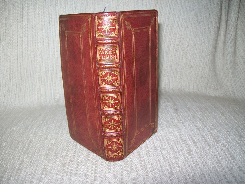 Anverpiae ex Officina Balthasaris Moreti 1629 (mentions portées au verso du dernier feuillet avec la belle marque de l'Imprimeur en regard). Petit in-12 étroit (12,5cm x 6cm) paginé 375 à 637. Plein maroquin grenat, dos à nerfs orné de cadres de filets à motifs étoilés dorés, plats décorés d'un encadrement de filets à la Du Seuil, coupes guillochées, tranches dorées, reliure du XVIIIeme siècle. Partie supérieure de la première page masquée à l'époque par une pièce de papier (en grande partie arrachée) afin de dissimuler les 14 premières lignes du texte ne faisant pas partie des Paralipomènes. FRAGMENT DU LIVRE DES CHRONIQUES avec les textes complets des PARALIPOMENES ET DE ESDRAS imprimés en latin sans traduction. exemplaire en bon état dans une reliure du XVIIIeme siècle à la Du Seuil décorative. (5137) nous proposons un autre extrait en reliure identique sous la référence GITk498