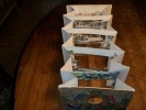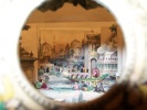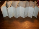 Pont-à-Mousson Haguenthal Editeur sans date vers 1860. Vue en perspective en accordéon, hauteur 14cm, largeur 19cm, longueur déplié environ 43cm, composée de 2 façades en carton et 4 sections de papier, le tout en lithographie rehaussée de couleurs à la main. La 1re façade, ornée d'une réunion d'enfants dans un décor champêtre, est percée d'un trou rond central à travers lequel on pourra avoir une vue en relief de la ville de Constantinople. La 2e façade, placée au fond de la perspective, offre une belle vue des monuments typiques de la ville (le verso étant occupé par de la publicité pour les créations Haguenthal et la liste des 12 modèles de la collection panoramique). Chaque section propose des éléments de décors et des personnages, créant l'effet d'optique. Bordure des carton légèrement usée, discret manque de décor en tête de la 1re section (parmi le feuillage du faîte des arbres). Intérieur en bon état, complet, ayant conservé toute la fraîcheur de ses couleurs. TRES RARE VUE PANORAMIQUE DE CONSTANTINOPLE, évoquant bien le charme exotique et la beauté architecturale de cette ville.