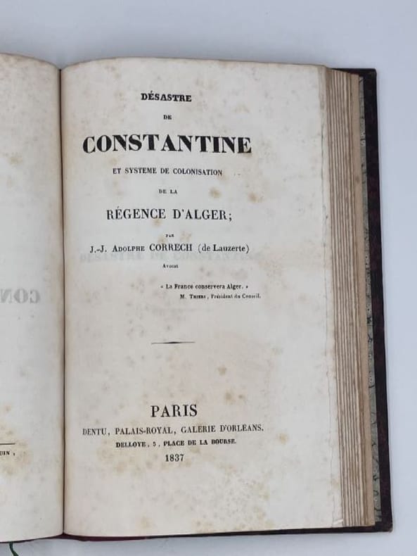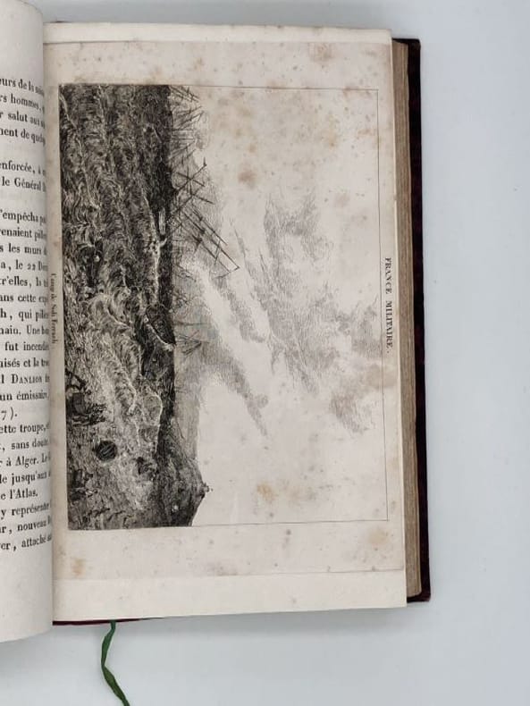 1834 Montpellier Chez Auguste Ricard, Imprimeur 1834 305 pp Inclus une gravure volante représentant Camp de Sidi Ferruch Coup de vent du 16 juin 1830Un volume in°8 reliure demi chagrin rouge, dos à nerfs titres et caissons dorés . Ex libris de la bibliothèque de Choisy