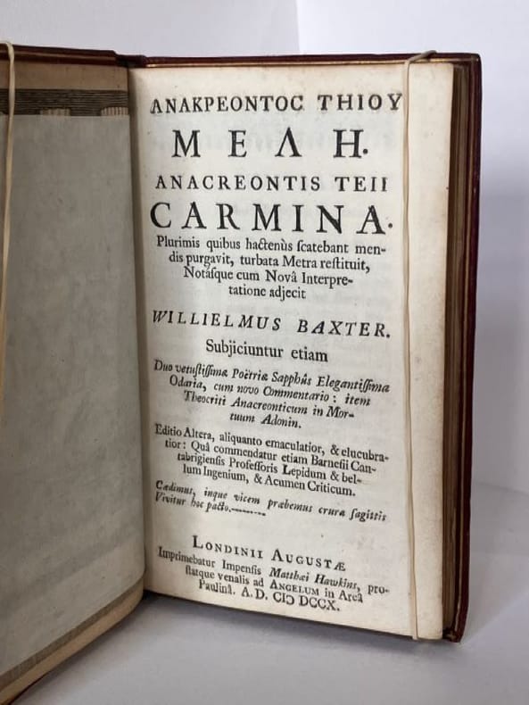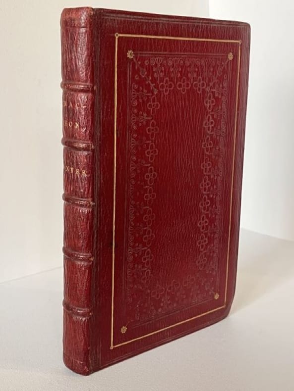 1710 LONDINI AUGUSTA Imprimebatur Impensis Matthei Hawkins, prostatque venalis ad Angelum in Areâ Paulinâ A. D. CIC DCCX. (1710) Un volume in°12 plein maroquin rouge, dos à nerfs. Décors floral estampé à froid sur les plats. Filet doré en encadrement sur les plats, les chasses et chants des plats; Tranches dorées. Portrait en frontispice 10 + 172 pages. Deuxième édition
