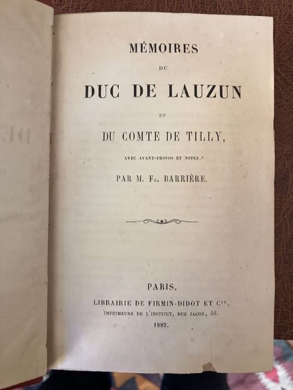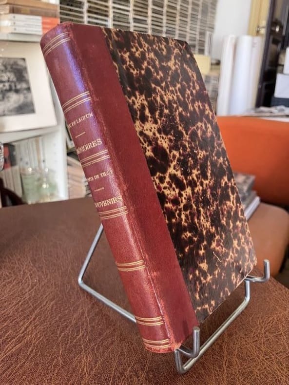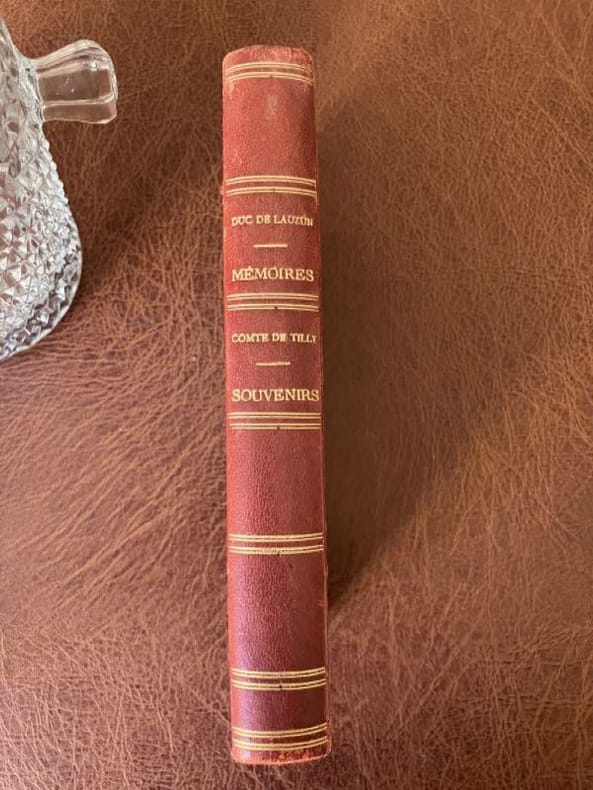 Paris, Librairie de Firmin-Didot, 1882 ;1 volume grand in-18°, demi -basane bleue de l'époque, filets à froid soulignant les nerfs, fleurons dorés aux entre-nerfs, titre doré " Mémoires du Duc de Lauzun "; 2ff.nch., 435pp.,1f.nch. Ex-libris cachet violet sur le faux-titre ( initiales H et S entrelacées).Reliure frottée aux nerfs et coiffes, très rares piqûres.