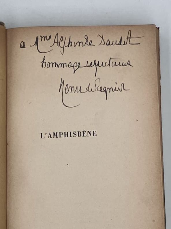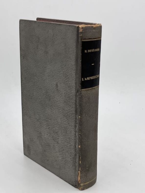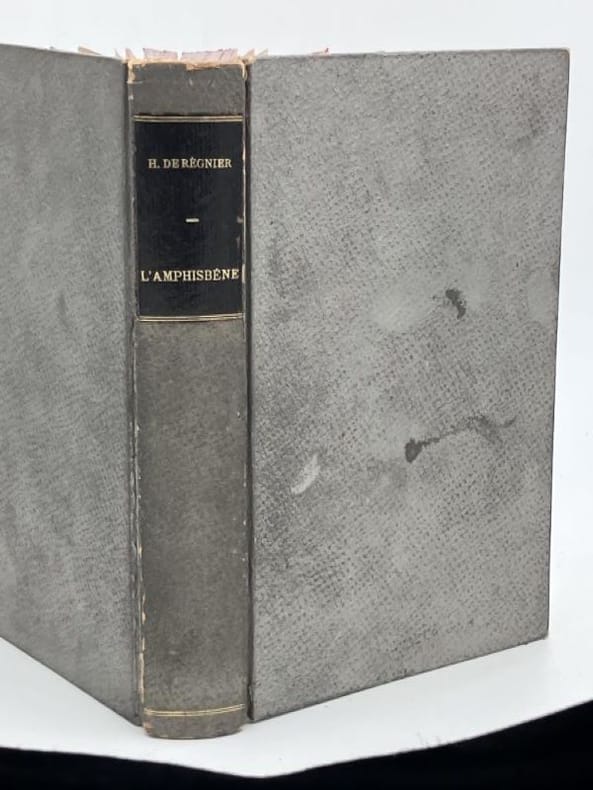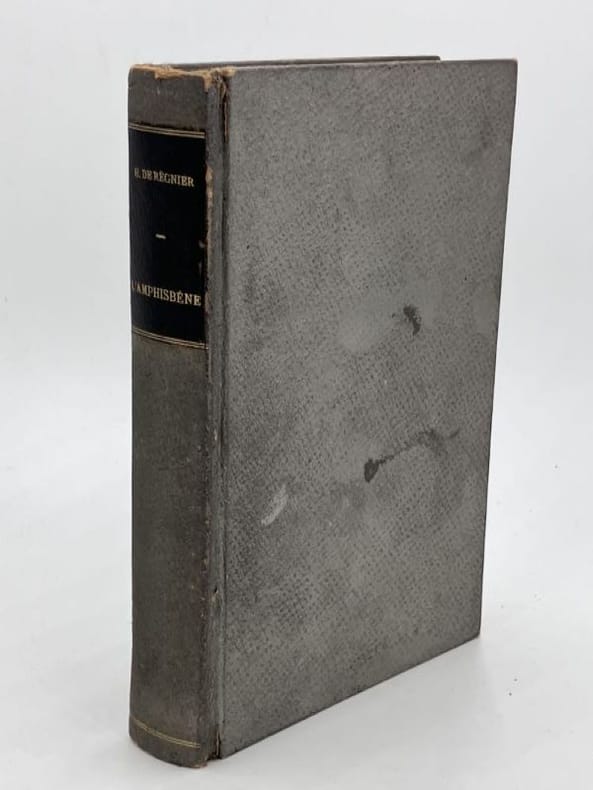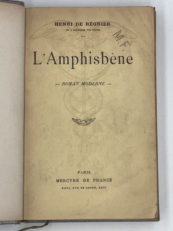 Henri de Régnier, L'Amphisbène. Paris, Mercure de France, 1912. In-12, 372-8p. Edition originale de ce roman, exemplaire du tirage courant, enrichi d'un envoi à Henry Gauthier Villard i.e. Willy : « à Henry Gauthier Villard / cordialement / Henri de Régnier ». On notera les initiales de Willy, « GV » sur la page de titre, et surtout cette succulente remarque près de l'envoi de Régnier : « Lent, harmonieux, un peu rasant ! La fin impertinente. W ». Demi-chagrin bleu, dos à nerfs, tête dorée, couvertures conservées. Dos légèrement passé. Très bel exemplaire, belle provenance