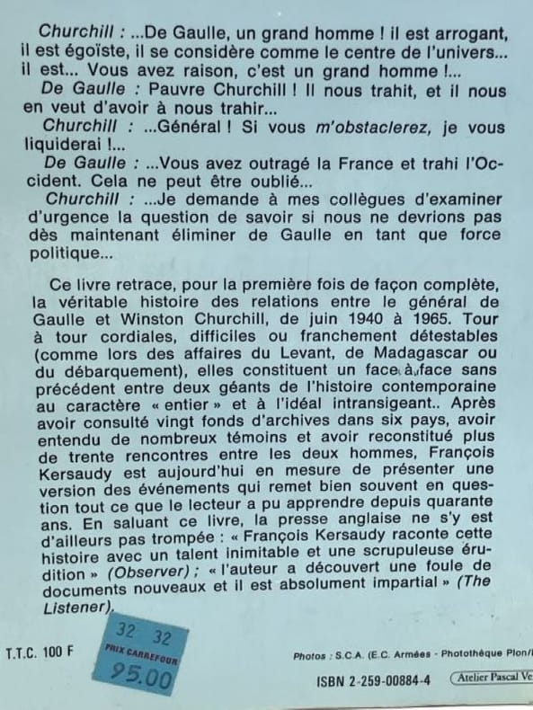 Lorsque s'affrontent les deux plus grands hommes d'Etat du XXe siècle, qui ne sont pas nécessairement les plus commodes, il faut bien s'attendre à des gerbes d'étincelles. Ayant consulté vingt fonds d'archives dans six pays et interrogé de nombreux témoins, François Kersaudy reconstitue plus de trente rencontres entre le Premier ministre britannique et le chef de la France Libre. Un livre véritablement unique, puisque c'est le seul ouvrage au monde qui soit exclusivement consacré aux relations d'amour et de haine entre Charles de Gaulle et Winston Churchill. L'ayant refermé, le lecteur considérera nécessairement d'un autre oeil les Mémoires de guerre du général de Gaulle et ceux de Winston Churchill.