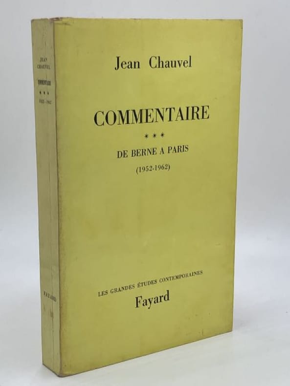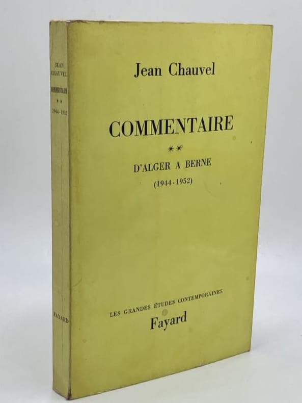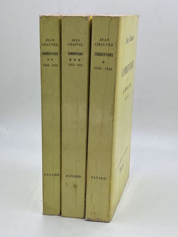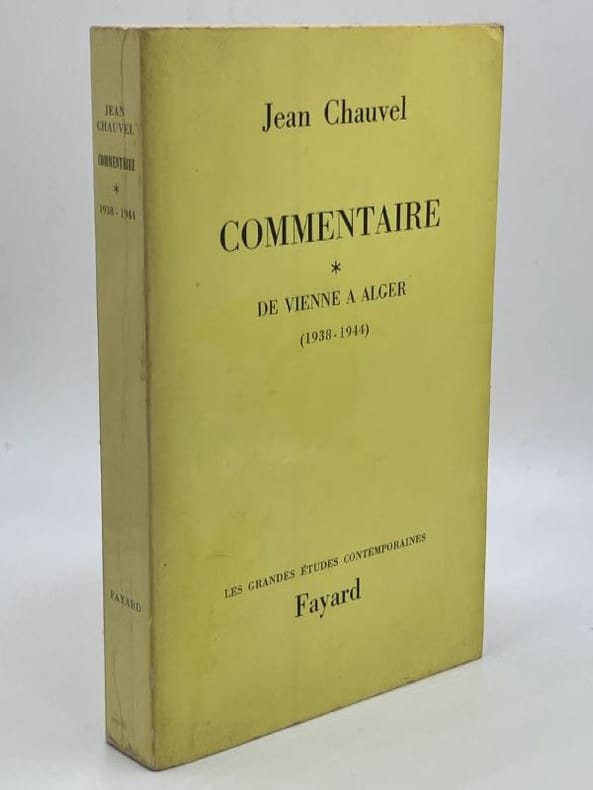 Complet en 3 volumes. — Entré dans la carrière en 1921, Jean Chauvel (1897-1979) était à Vienne lors de l'Anschluss. En novembre 1942, au moment de l'invasion de la "zone libre", Chauvel est le diplomate de plus haut rang à démissionner, emmenant avec lui tous les jeunes. Il entre alors dans la clandestinité et fonde un groupe de réflexion chargé de reconstituer les nombreuses archives détruites dans la panique de 1940. Il rejoint le gouvernement provisoire à Alger début 1944. Dans l'été, il est nommé avec un titre équivalent à celui de secrétaire général des Affaires étrangères, détenu avant guerre par Alexis Léger réfugié aux Etats-Unis. Un différend l'oppose à de Gaulle et Chauvel s'éloigne. Le départ de de Gaulle provoque son rappel avec le titre de secrétaire général (1946-1949) et la dignité d'ambassadeur de France. En 1949, il se fait désigner comme ambassadeur auprès de l'ONU qui n'a pas encore de siège fixe. Il part bientôt pour New York. Il y restera jusqu'en 1952. De là, il est envoyé à Berne en Suisse. Jean Chauvel est ambassadeur à Berne en février 1952. Il y devient en 1954 le principal négociateur français de la conférence pour finir la guerre d'Indochine tenue à Genève sous l'égide de Bidault puis de Mendès France. Son dernier poste diplomatique est Londres (1955-1962). Là, il doit affronter la crise de Suez en 1956, la signature du traité de Rome sur la Communauté européenne, le changement de régime en 1958 et bien sûr les difficultés liées à la guerre d'Algérie... — "Le premier tome de "Commentaire" de l'ambassadeur de France Jean Chauvel nous apporte une masse précieuse de « choses vues » sur la période qui s'étend des dernières années de l'avant-guerre à l'occupation de la zone sud par la Wehrmacht. M. Jean Chauvel était bien placé pour le faire. Qu'on en juge plutôt : nommé à Vienne à la Légation de France peu avant l'Anschluss, celui-ci y reste après l'entrée des troupes allemandes comme consul général ; il fut rappelé en France à la fin de 1938 pour se voir confier la direction d'Asie au Quai d'Orsay. II conserva ce poste jusqu'au sabordage de la flotte française à Toulon (novembre 1942) ; après quoi, il reprit sa liberté et gagna Alger où les autorités françaises devaient le charger du secrétariat général aux Affaires étrangères. Par la période qu'il recouvre, ce volume est donc très intéressant. II l'est particulièrement pour l'histoire de la « drôle de guerre » et de Vichy que l'auteur a vécue dans cet observatoire de choix qu'était « le Quai » jusqu'en juin 1940, puis sur les routes de France, de château en château pour aboutir à Bordeaux d'abord, puis finalement dans la capitale « provisoire » de Vichy, dans un hôtel requisitionné pour le ministère des Affaires étrangères..." (Claude Lévy, Revue d'histoire de la Deuxième Guerre mondiale, 1974)