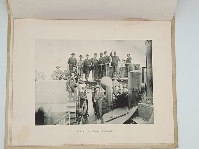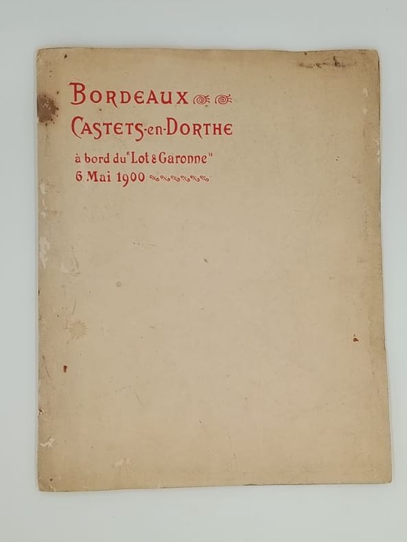1900 Bordeaux Wetterwald Frères sd circa 1900 Programme in°4 broché Avec deux illustrations du Chateau de Castets en Dorthe, Une photographie de personnages sur le pont du navire, Le menu servi à bord le tout sous serpente, et un poème humoristique de 5 pages L'embarras du choix (extrait d'un conte persan) LR64