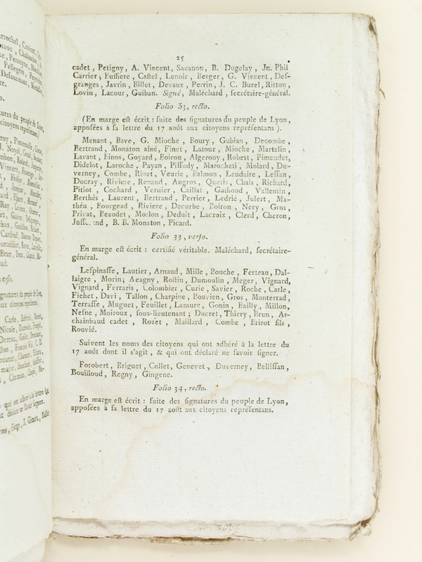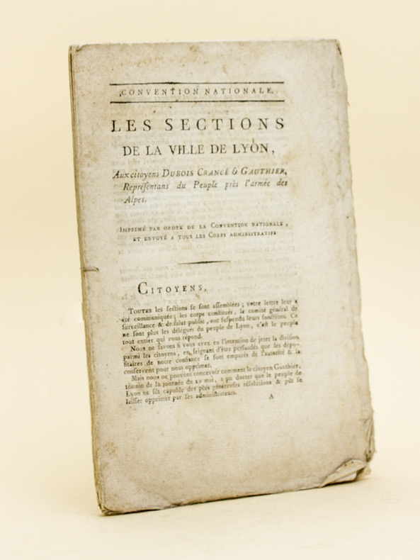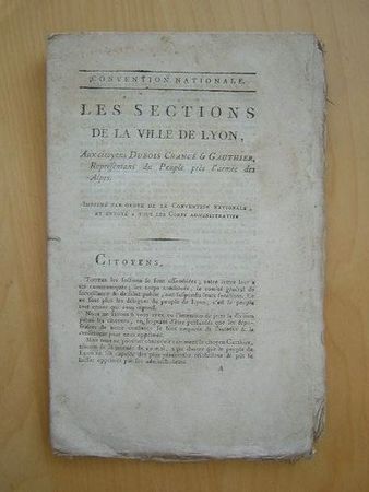 Edition originale. Bon état (première page lég. frottée, cordelette réunissant les 6 cahiers). La quasi totalité du document est constituée de la liste de tous les sectionnaires, et pétitionnaires, de la ville de Lyon. Peu courant.