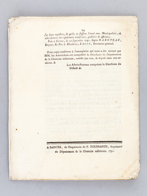1 brochure in-4 br., De l'Imprimerie de P. Toussaints, Saintes, 1791, 24 pp.