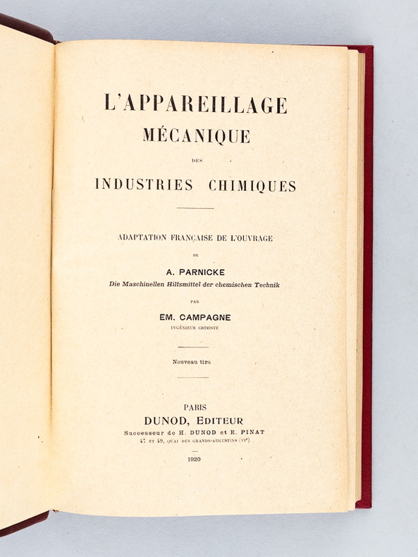 Adaptation française de l'ouvrage de A. Parnicke "Die Maschinellen Hilfsmittel der chemischen Technik", 1 vol. in-4 relié demi-chagrin bordeaux, Dunod, Paris, 1920, 356 pp.