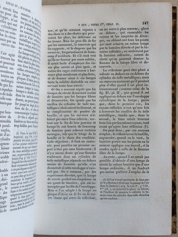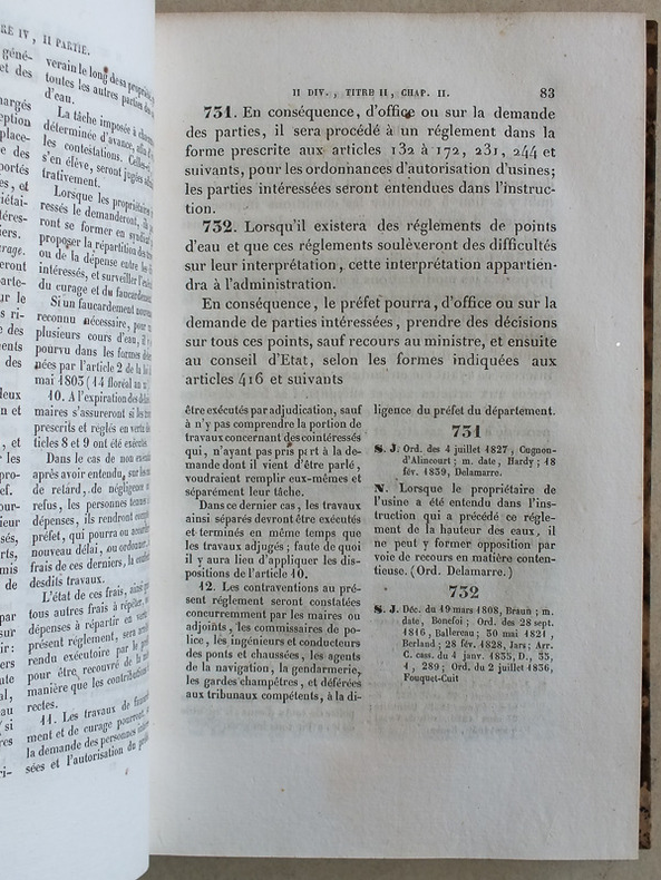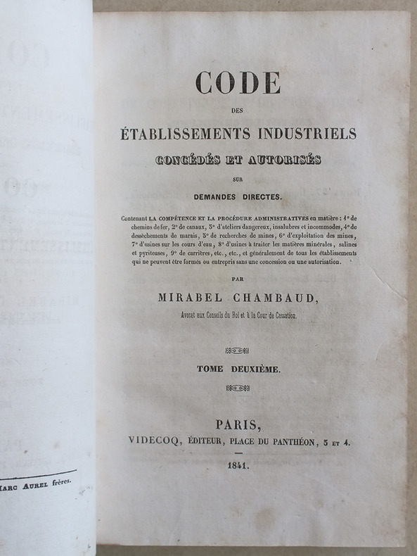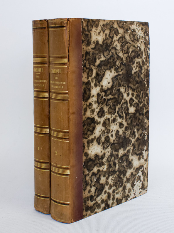 Contenant la compétence et la procédure administratives en matière : 1° de chemins de fer ; 2° de canaux ; 3° d'ateliers dangereux, insalubres et incommodes ; 4° de dessèchements de marais ; 5° de recherches de mines ; 6° d'exploitation de mines ; 7° d'usine sur les cours d'eau ; 8° d'usines à traiter les matières minérales, salines et pyriteuses ; 9° de carrières, etc., 2 vol. in-8 reliure demi-basane marron, Videcoq, Paris, 1841, XXXI-431 ; 556 pp.
