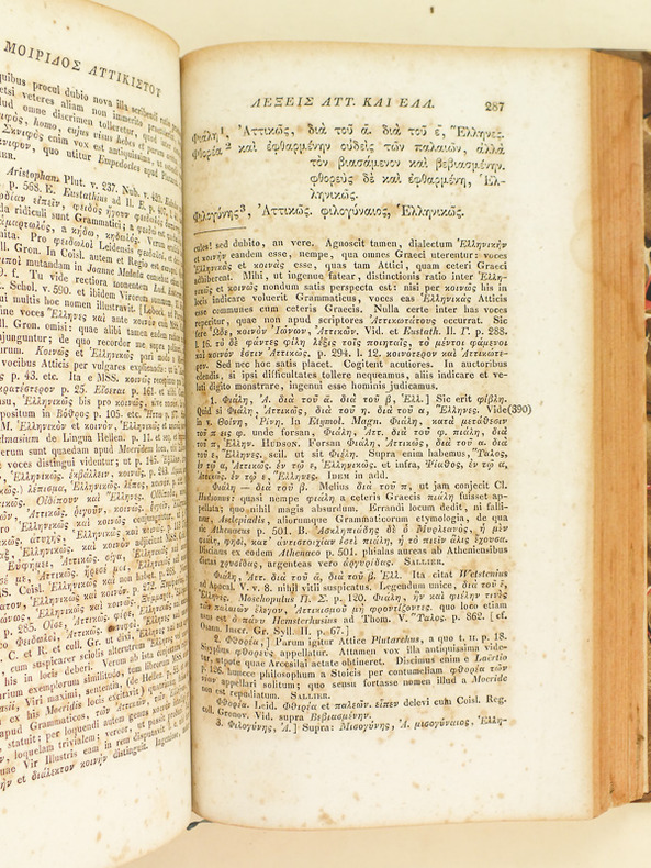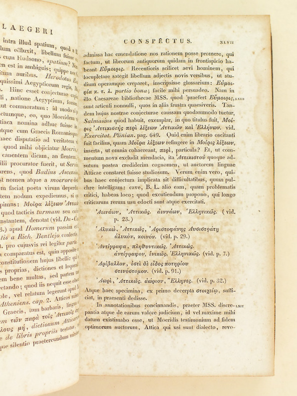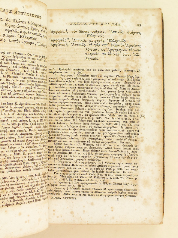 1 vol. in-8 reliure de l'époque demi-veau brun, dos à 5 nerfs, Sumptibus C.H. F. Hartmanni, Lipsiae [ Leipzig], 1831, xlix-386 pp. 1 f., 162 pp.Rappel du titre complet : Moeridis Atticistae Lexicon Atticum cum Jo. udosni, Steph. Bergleri, Claud. Sallierii aliorumque notis. Secundum ordinem msstorum restitutit, emendavit, animadversionibus illustravit Joannes Piersonus accedit Aelii Herodiani Philetaerus. Edition nova, auctior cui addita sunt Piersoni Verisimilia [ Joannis Piersoni Verisimilium Libri Duo ]