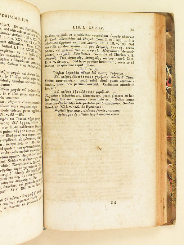 Etat satisfaisant (très fortes rouss. avec petite mouill. marginale, accrocs avec mq. en coiffes). Texte en grec et commentaires en latin. Recteur du Gymnase de Leeuwarden en 1755, Jean Pierson dut sa place à son Verisimilium libri duo. C'est un recueil de corrections et de conjectures que l'auteur propose pour la restitution du texte des anciens classiques grecs et latins. "Au total son ouvrage est celui d'un bon philologue, qui aurait produit des travaux plus importants su la mort ne l'eût enlevé aux lettres en 1759, à l'âge de 29 ans" (Michaud, XXXIII, 291).